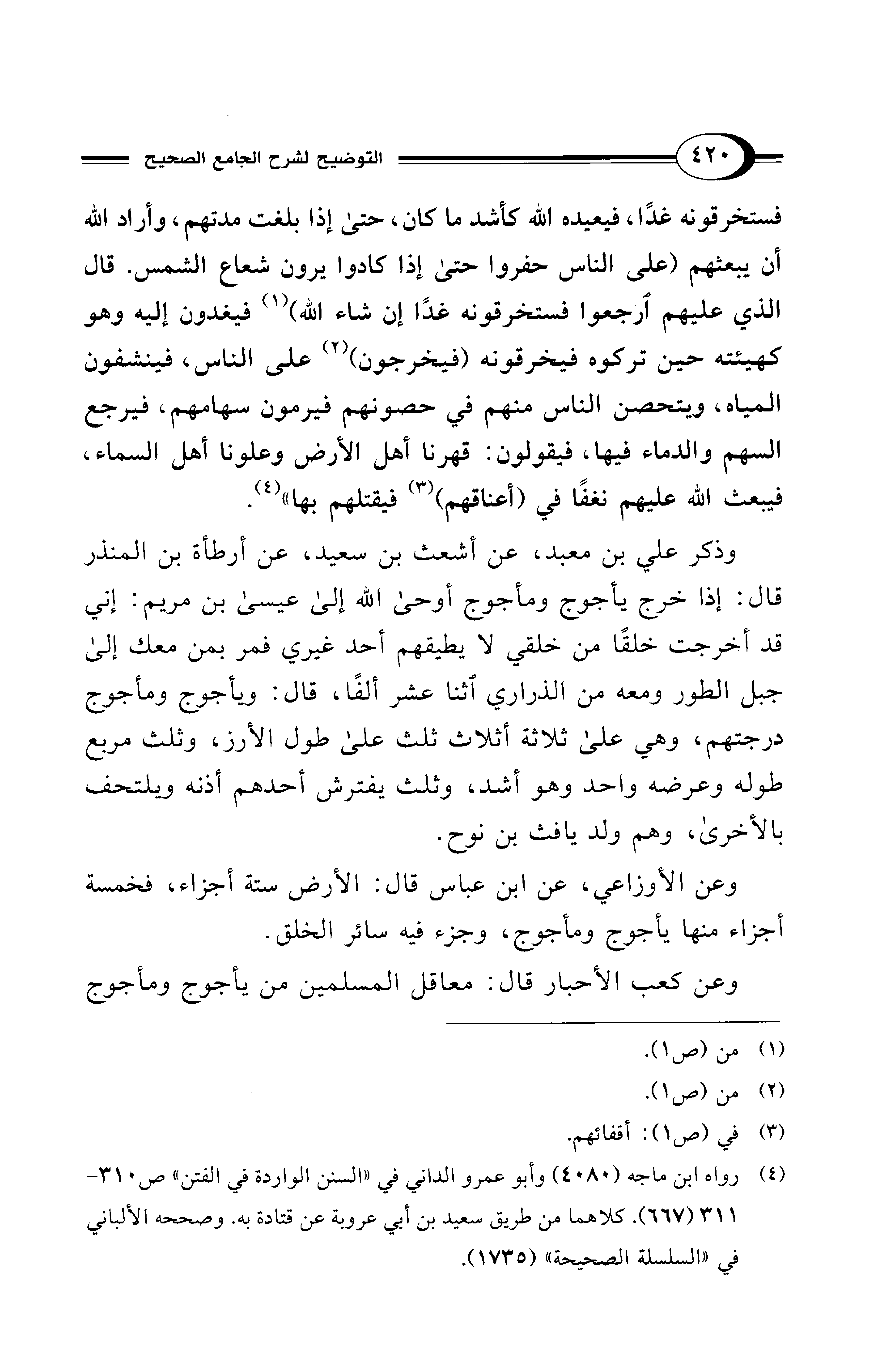 وذكر علي بن معبد، عن أشعث بن سعيد، عن أرطأة بن المنذر قال: إذا خرج يأجوج ومأجوج أوحى الله إلى عيسى بن مريم: إني قد أخرجت خلقًا من خلقي لا يطيقهم أحد غيري فمر بمن معك إلى جبل الطور ومعه من الذراري اثنا عشر ألفًا، قال: ويأجوج ومأجوج درجتهم، وهي على ثلاثة أثلاث ثلث على طول الأرز، وثلث مربع طوله وعرضه واحد وهو أشد، وثلث يفترش أحدهم أذنه ويلتحف بالأخرى، وهم ولد يافث بن نوح.