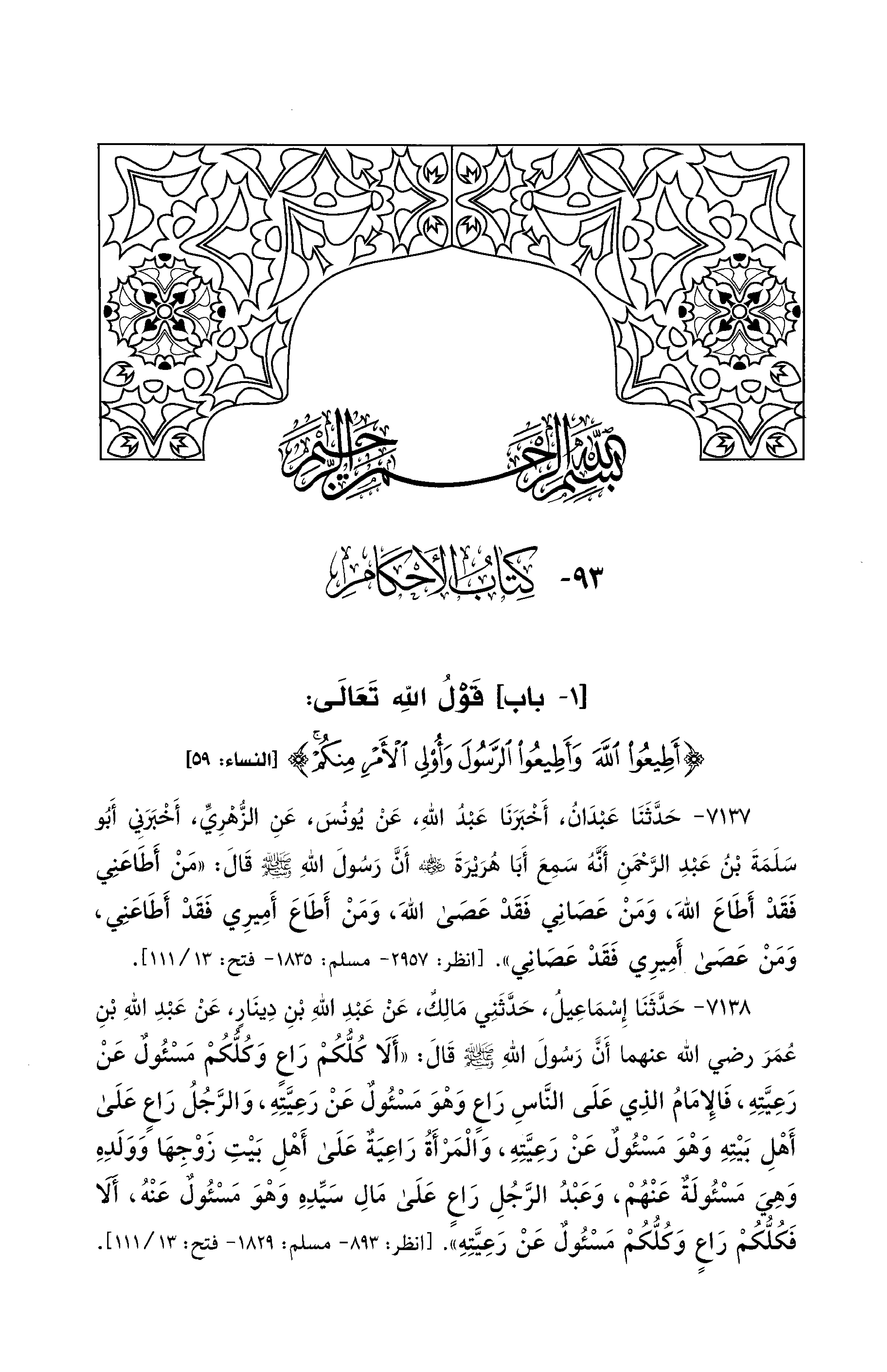 [1 - باب] قَوْلِ اللهِ تَعَالَى: {أَطِيعُوا اللهَ وَأَطِيعُوا الرَّسُولَ وَأُولِى الأَمْرِ مِنْكُمْ} [النساء: 59]