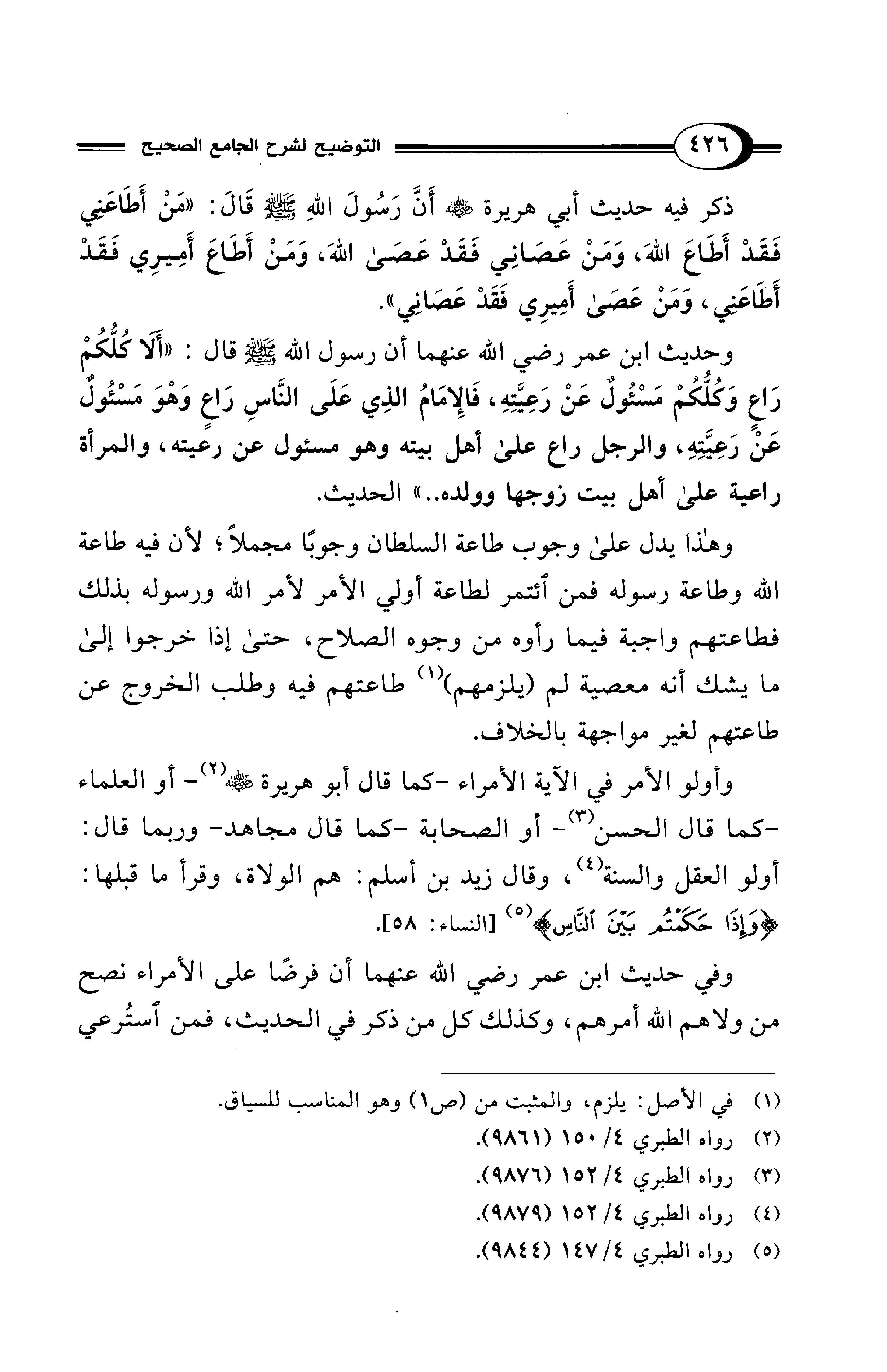 وهذا يدل على وجوب طاعة السلطان وجوبًا مجملاً؛ لأن فيه طاعة الله وطاعة رسوله فمن ائتمر لطاعة أولي الأمر لأمر الله ورسوله بذلك فطاعتهم واجبة فيما رأوه من وجوه الصلاح، حتى إذا خرجوا إلى ما يشك أنه معصية لم (يلزمهم) (¬1) طاعتهم فيه وطلب الخروج عن طاعتهم لغير مواجهة بالخلاف.