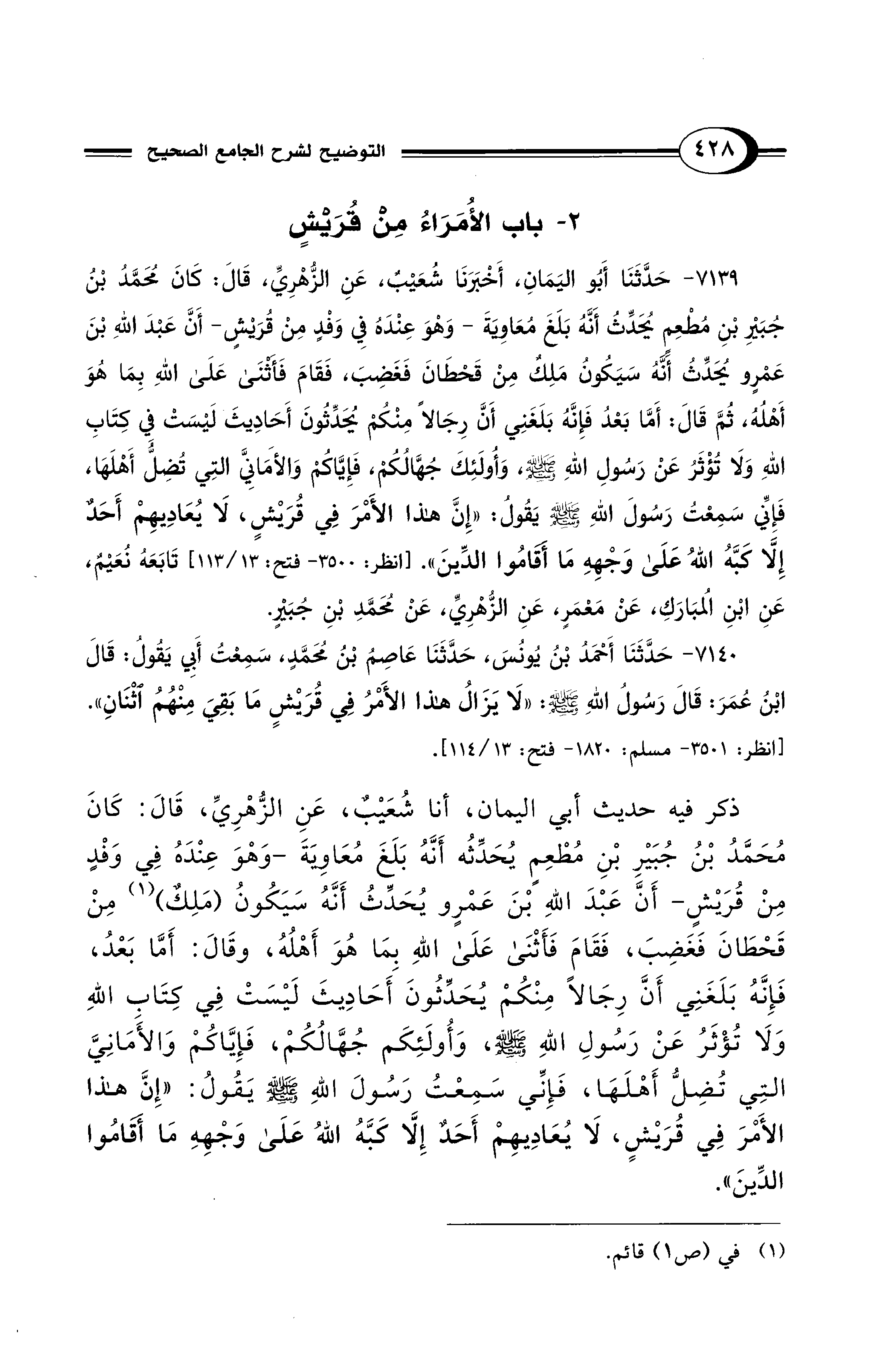 7139 - حَدَّثَنَا أَبُو الْيَمَانِ، أَخْبَرَنَا شُعَيْبٌ، عَنِ الزُّهْرِيِّ، قَالَ: كَانَ مُحَمَّدُ بْنُ جُبَيْرِ بْنِ مُطْعِمٍ يُحَدِّثُ أَنَّهُ بَلَغَ مُعَاوِيَةَ -وَهْوَ عِنْدَهُ فِي وَفْدٍ مِنْ قُرَيْشٍ- أَنَّ عَبْدَ اللهِ بْنَ عَمْرٍو يُحَدِّثُ أَنَّهُ سَيَكُونُ مَلِكٌ مِنْ قَحْطَانَ فَغَضِبَ، فَقَامَ فَأَثْنَى عَلَى اللهِ بِمَا هُوَ أَهْلُهُ، ثُمَّ قَالَ: أَمَّا بَعْدُ فَإِنَّهُ بَلَغَنِي أَنَّ رِجَالاً مِنْكُمْ يُحَدِّثُونَ أَحَادِيثَ لَيْسَتْ فِي كِتَابِ اللهِ، وَلاَ تُؤْثَرُ عَنْ رَسُولِ اللهِ - صلى الله عليه وسلم - وَأُولَئِكَ جُهَّالُكُمْ، فَإِيَّاكُمْ وَالأَمَانِيَّ الَّتِي تُضِلُّ أَهْلَهَا، فَإِنِّي سَمِعْتُ رَسُولَ اللهِ - صلى الله عليه وسلم - يَقُولُ: «إِنَّ هَذَا الأَمْرَ فِي قُرَيْشٍ، لاَ يُعَادِيهِمْ أَحَدٌ إِلاَّ كَبَّهُ اللهُ عَلَى وَجْهِهِ مَا أَقَامُوا الدِّينَ». [انظر: 3500 - فتح: 13/ 113] تَابَعَهُ نُعَيْمٌ، عَنِ ابْنِ الْمُبَارَكِ، عَنْ مَعْمَرٍ، عَنِ الزُّهْرِيِّ، عَنْ مُحَمَّدِ بْنِ جُبَيْرٍ.