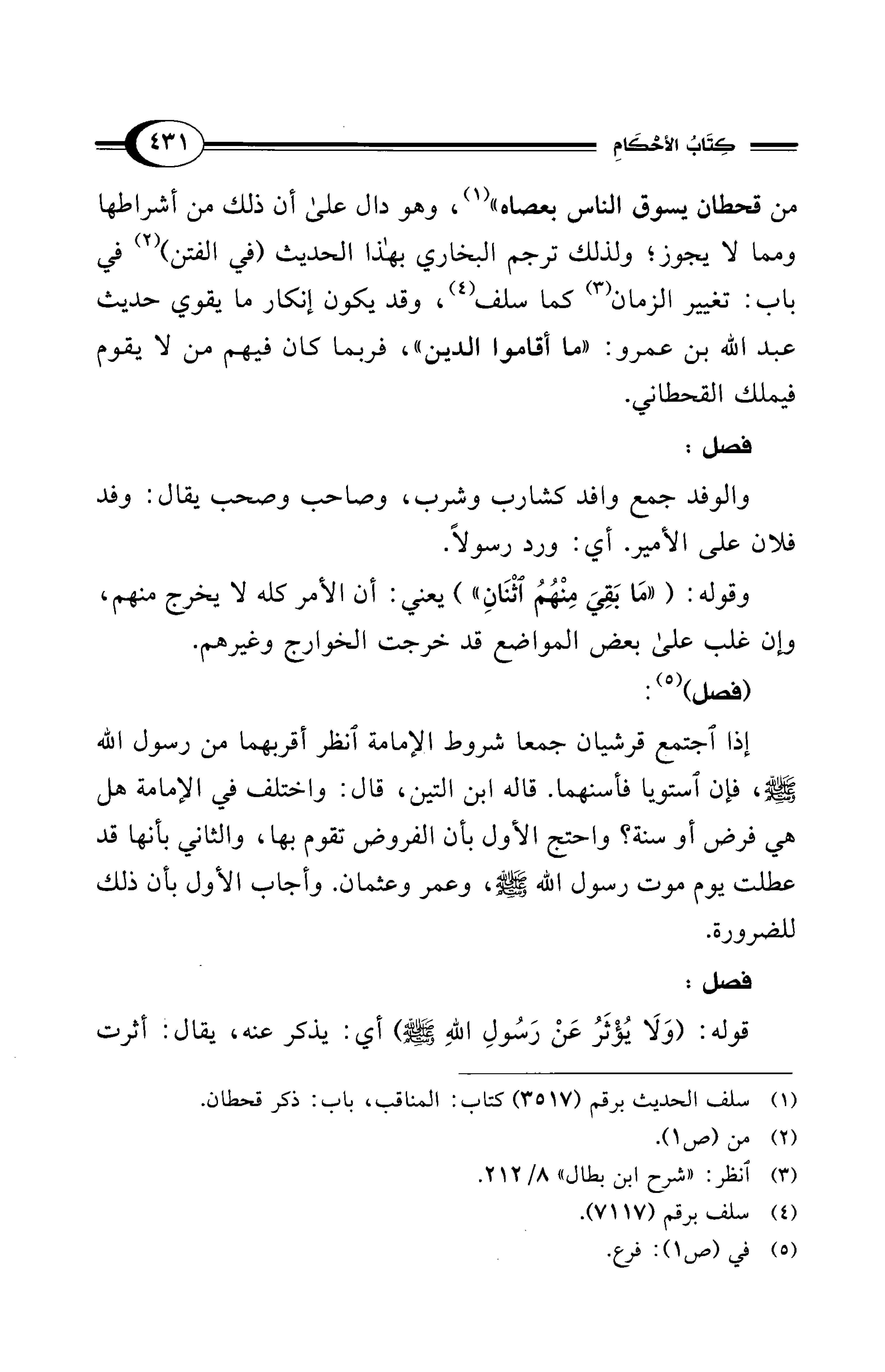 من قحطان يسوق الناس بعصاه" (¬1)، وهو دال على أن ذلك من أشراطها ومما لا يجوز؛ ولذلك ترجم البخاري بهذا الحديث (في الفتن) (¬2) في باب: تغيير الزمان (¬3) كما سلف (¬4)، وقد يكون إنكار ما يقوي حديث عبد الله بن عمرو: "ما أقاموا الدين"، فربما كان فيهم من لا يقوم فيملك القحطاني.
