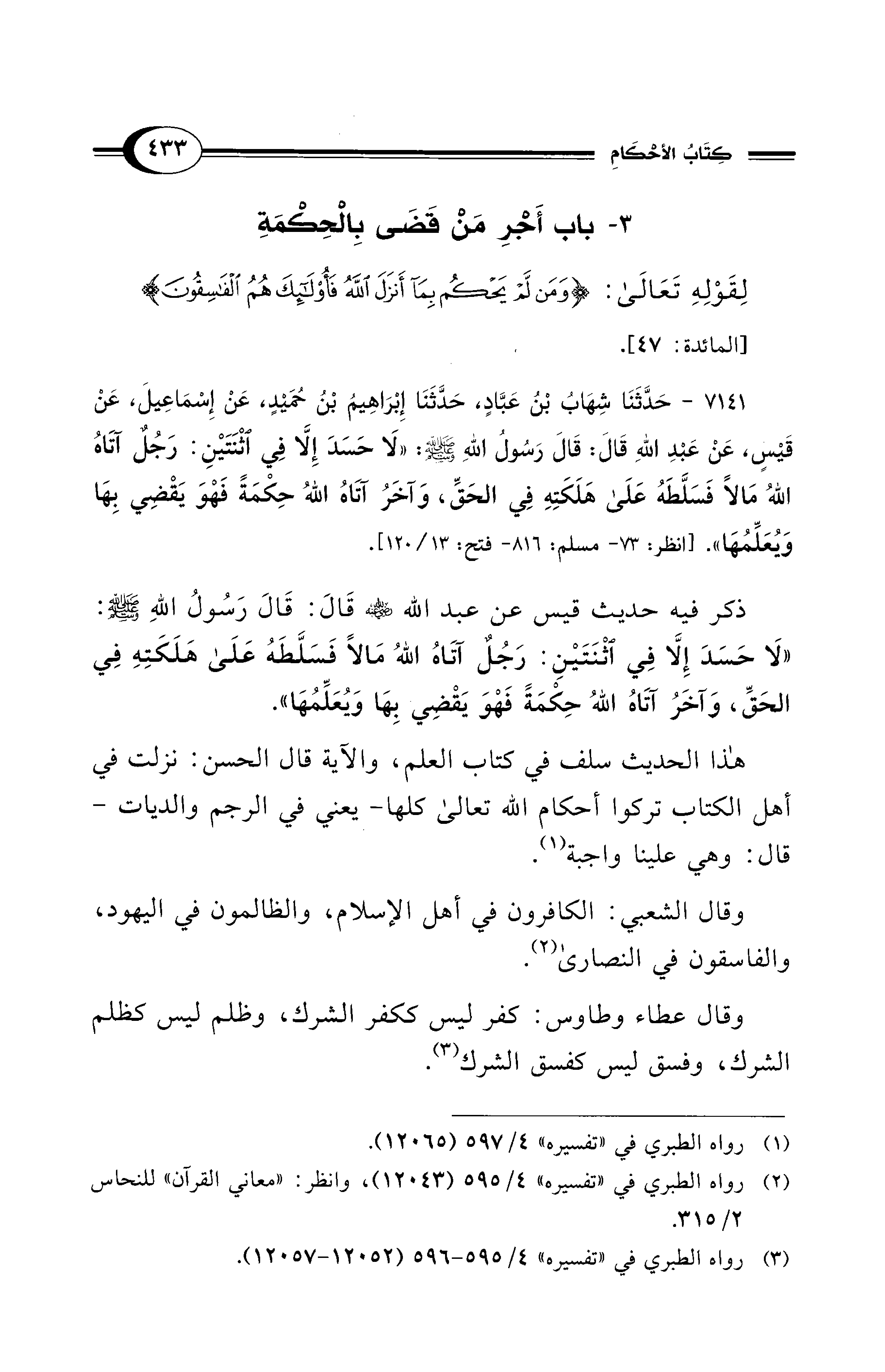 7141 - حَدَّثَنَا شِهَابُ بْنُ عَبَّادٍ، حَدَّثَنَا إِبْرَاهِيمُ بْنُ حُمَيْدٍ، عَنْ إِسْمَاعِيلَ، عَنْ قَيْسٍ، عَنْ عَبْدِ اللهِ قَالَ: قَالَ رَسُولُ اللهِ - صلى الله عليه وسلم -: «لاَ حَسَدَ إِلاَّ فِي اثْنَتَيْنِ: رَجُلٌ آتَاهُ اللهُ مَالاً فَسَلَّطَهُ عَلَى هَلَكَتِهِ فِي الْحَقِّ، وَآخَرُ آتَاهُ اللهُ حِكْمَةً فَهْوَ يَقْضِى بِهَا وَيُعَلِّمُهَا». [انظر: 73 - مسلم: 816 - فتح: 13/ 120].