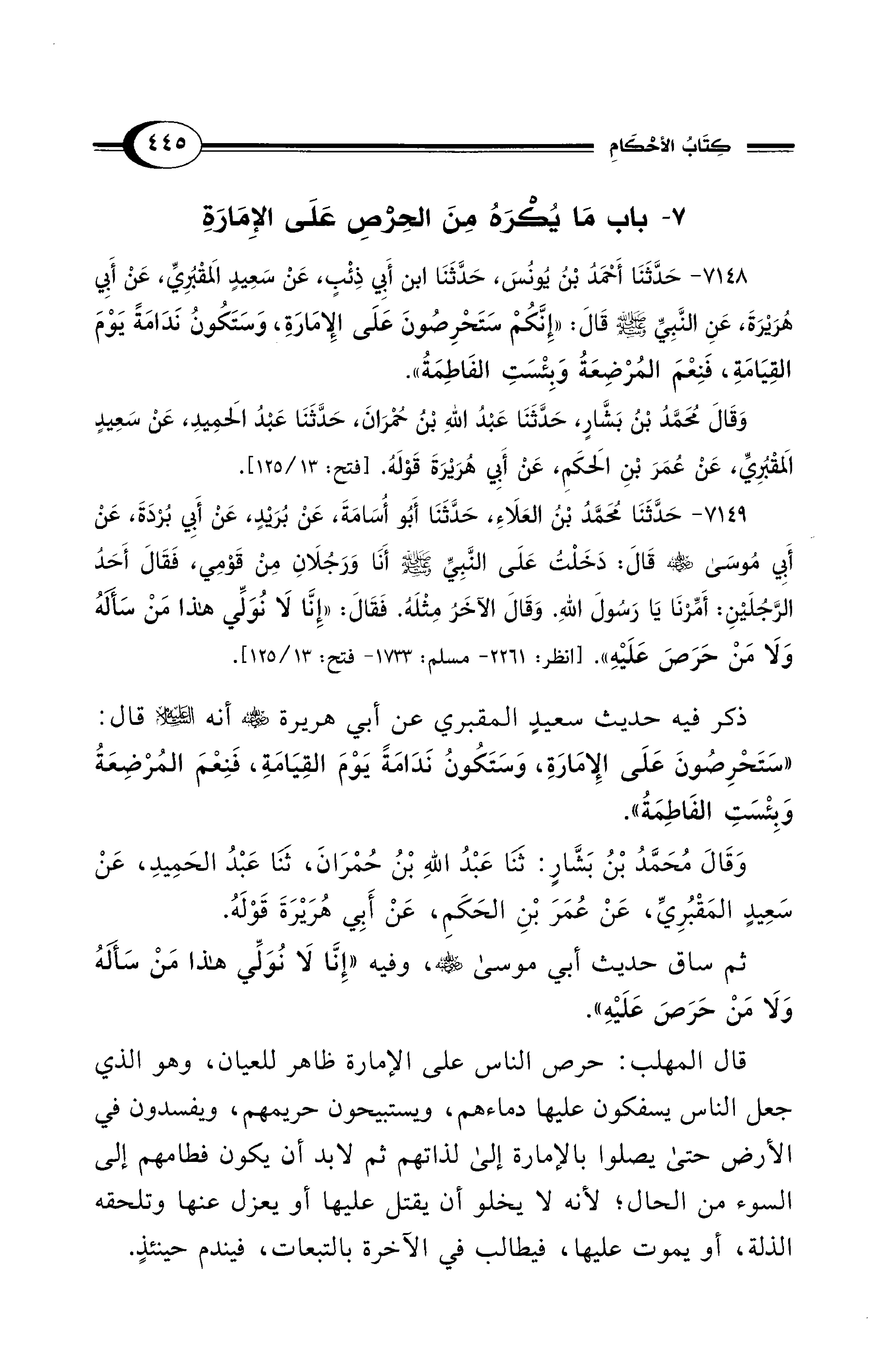 7149 - حَدَّثَنَا مُحَمَّدُ بْنُ الْعَلاَءِ، حَدَّثَنَا أَبُو أُسَامَةَ، عَنْ بُرَيْدٍ، عَنْ أَبِي بُرْدَةَ، عَنْ أَبِي مُوسَى - رضي الله عنه - قَالَ: دَخَلْتُ عَلَى النَّبِيِّ - صلى الله عليه وسلم - أَنَا وَرَجُلاَنِ مِنْ قَوْمِي، فَقَالَ أَحَدُ الرَّجُلَيْنِ: أَمِّرْنَا يَا رَسُولَ اللهِ. وَقَالَ الآخَرُ مِثْلَهُ. فَقَالَ: «إِنَّا لاَ نُوَلِّي هَذَا مَنْ سَأَلَهُ وَلاَ مَنْ حَرَصَ عَلَيْهِ». [انظر: 2261 - مسلم: 1733 - فتح: 13/ 125].