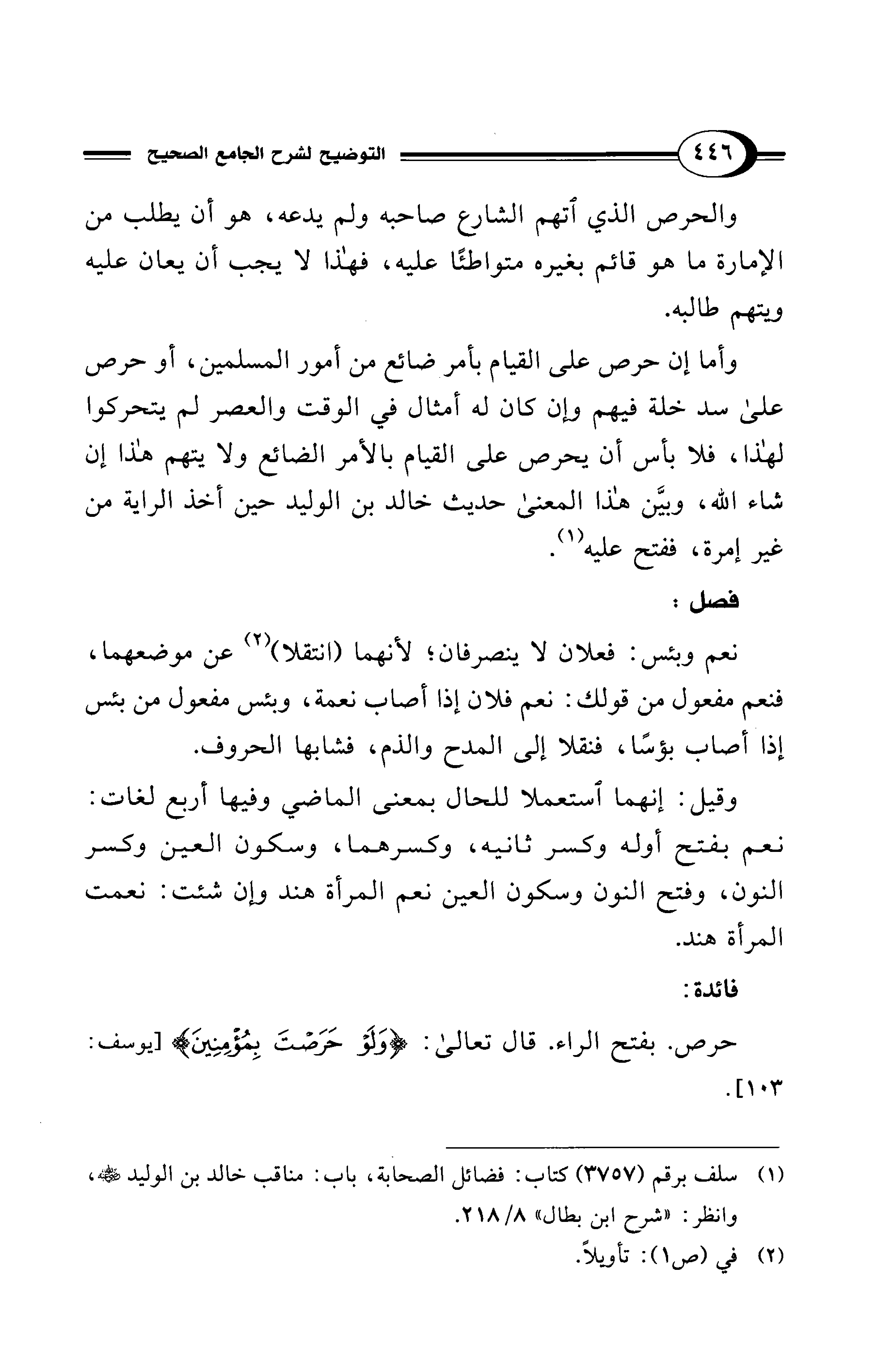 وأما إن حرص على القيام بأمر ضائع من أمور المسلمين أو حرص على سد خلة فيهم وإن كان له أمثال في الوقت والعصر لم يتحركوا لهذا، فلا بأس أن يحرص على القيام بالأمر الضائع ولا يتهم هذا إن شاء الله، وبيَّن هذا المعنى حديث خالد بن الوليد حين أخذ الراية من غير إمرة، ففتح عليه (¬1).