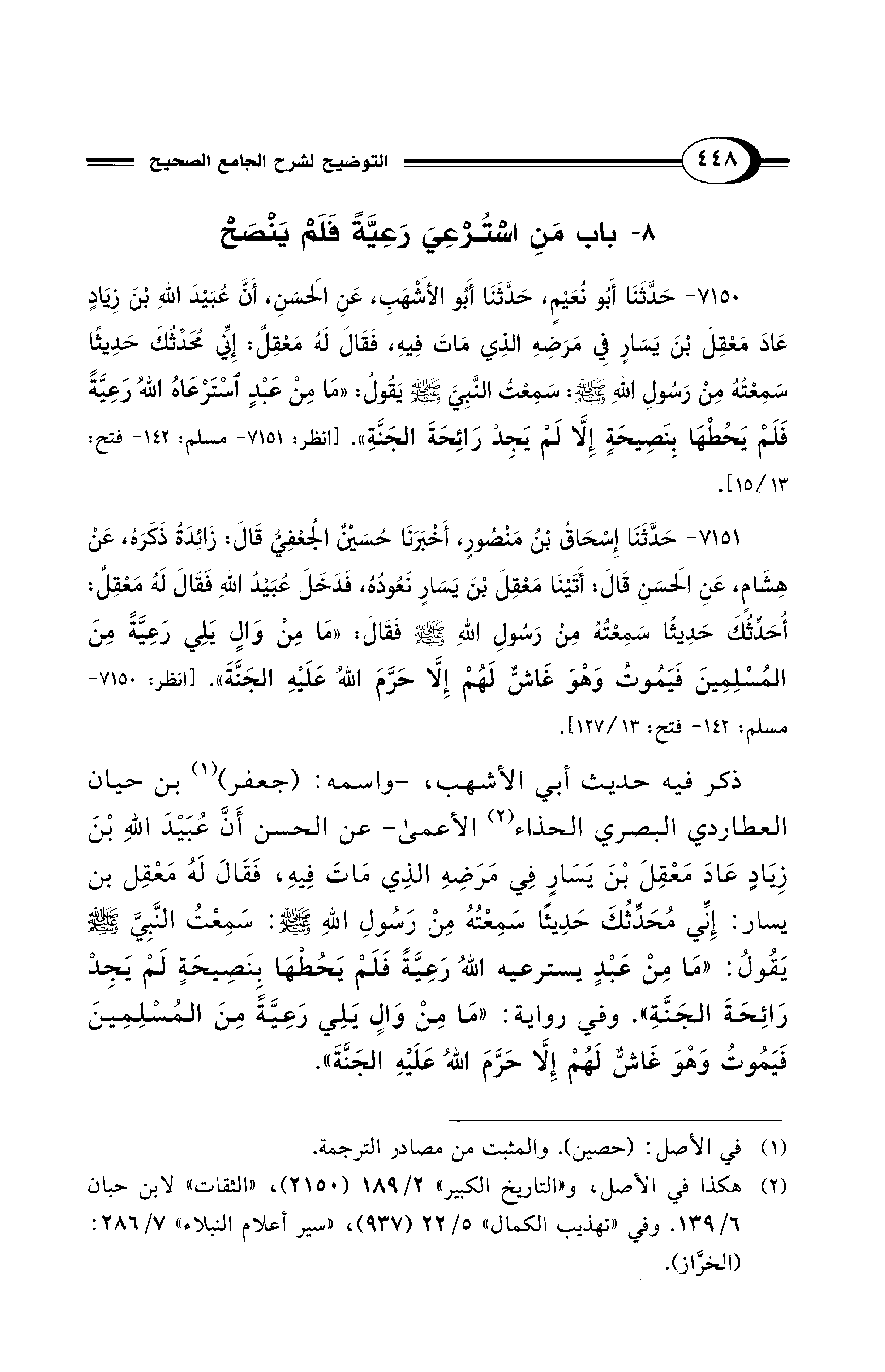 7150 - حَدَّثَنَا أَبُو نُعَيْمٍ، حَدَّثَنَا أَبُو الأَشْهَبِ، عَنِ الحَسَنِ، أَنَّ عُبَيْدَ اللهِ بْنَ زِيَادٍ عَادَ مَعْقِلَ بْنَ يَسَارٍ فِي مَرَضِهِ الَّذِي مَاتَ فِيهِ، فَقَالَ لَهُ مَعْقِلٌ: إِنِّي مُحَدِّثُكَ حَدِيثًا سَمِعْتُهُ مِنْ رَسُولِ اللهِ - صلى الله عليه وسلم -: سَمِعْتُ النَّبِيَّ - صلى الله عليه وسلم - يَقُولُ: «مَا مِنْ عَبْدٍ اسْتَرْعَاهُ اللهُ رَعِيَّةً فَلَمْ يَحُطْهَا بِنَصِيحَةٍ، إِلاَّ لَمْ يَجِدْ رَائِحَةَ الجَنَّةِ». [انظر: 7151 - مسلم: 142 - فتح: 13/ 15].
