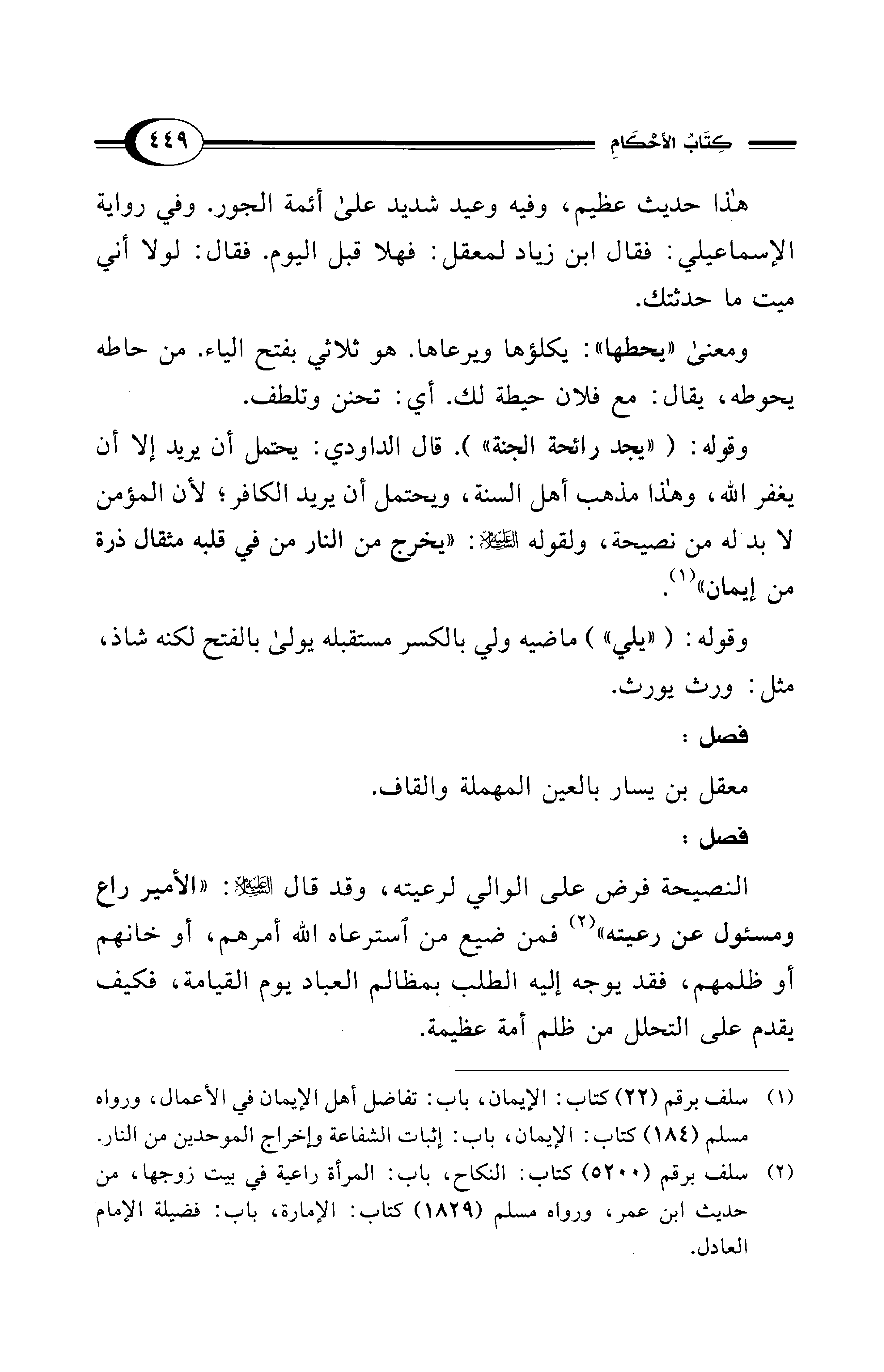 هذا حديث عظيم، وفيه وعيد شديد على أئمة الجور. وفي رواية الإسماعيلي: فقال ابن زياد لمعقل: فهلا قبل اليوم. فقال: لولا أني ميت ما حدثتك.