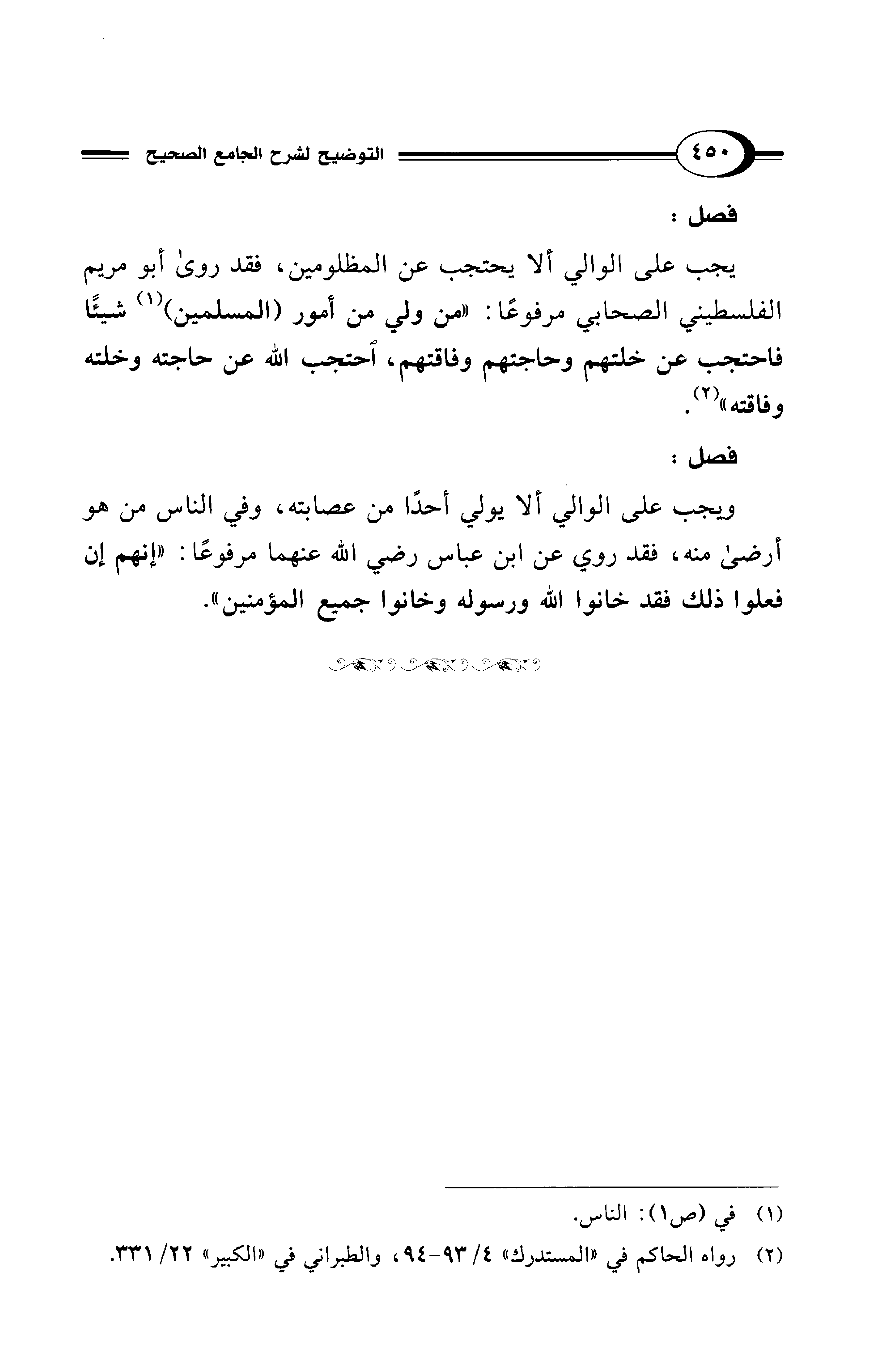 يجب على الوالي ألا يحتجب عن المظلومين، فقد روى أبو مريم الفلسطيني الصحابي مرفوعًا: "من ولي من أمور (المسلمين) (¬1) شيئًا فاحتجب عن خلتهم وحاجتهم وفاقتهم، احتجب الله عن حاجته وخلته وفاقته" (¬2).