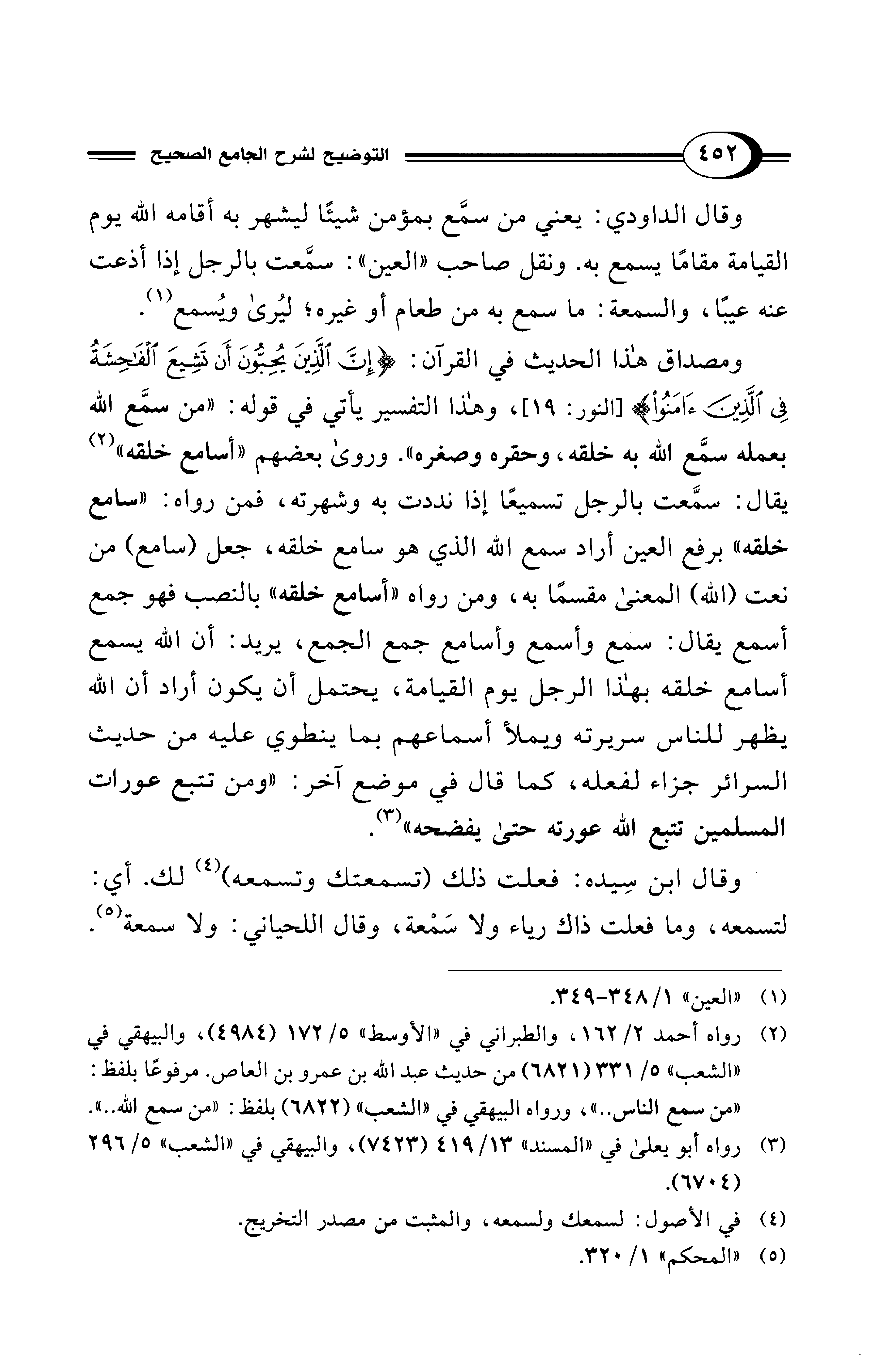 وقال الداودي: يعني من سمَّع بمؤمن شيئًا ليشهر به أقامه الله يوم القيامة مقامًا يسمع به. ونقل صاحب "العين": سمَّعت بالرجل إذا أذعت عنه عيبًا، والسمعة: ما سمع به من طعام أو غيره؛ ليُرى ويُسمع (¬1).