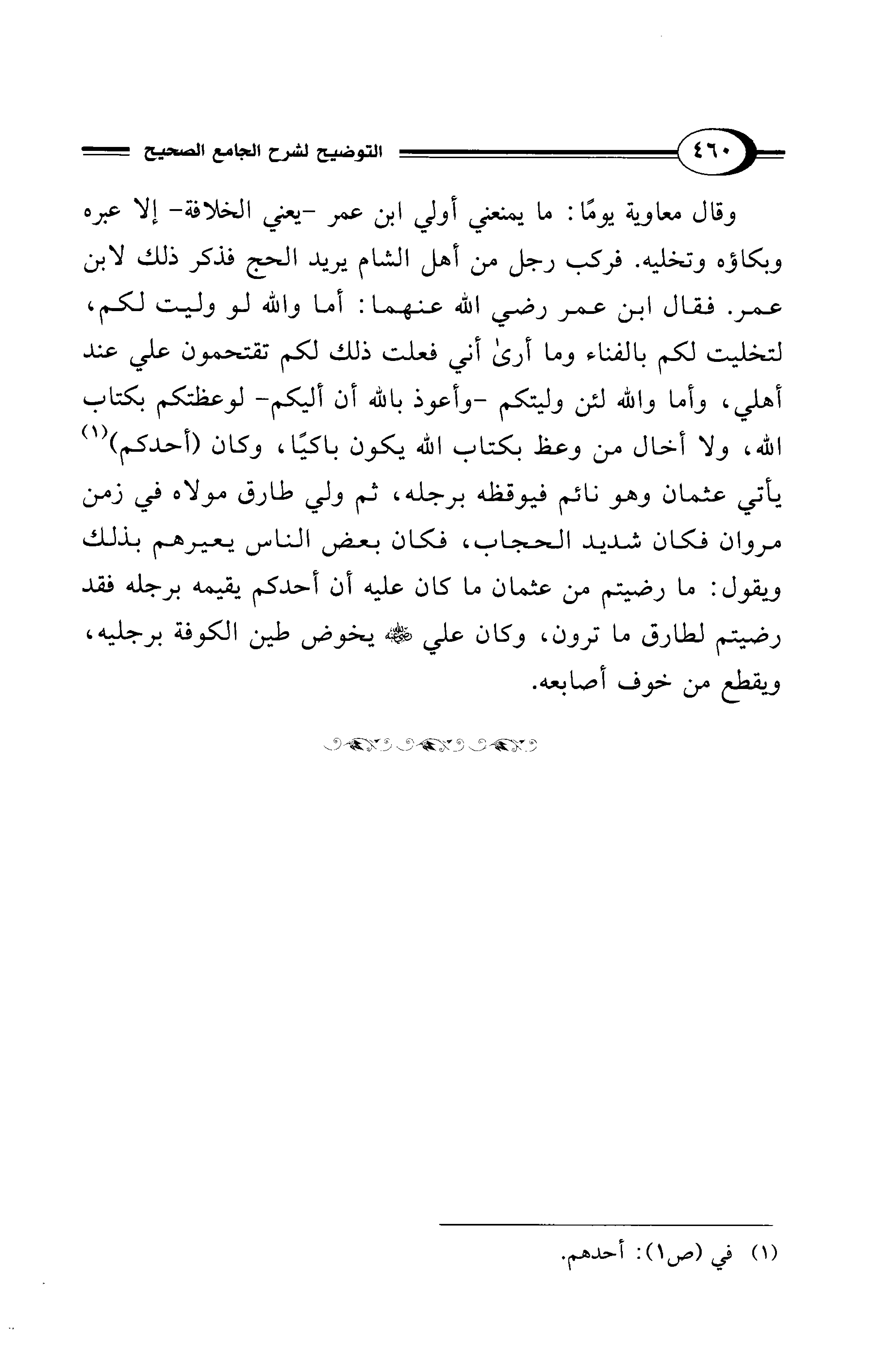 وقال معاوية يومًا: ما يمنعني أولي ابن عمر -يعني الخلافة- إلا عبره وبكاؤه وتخليه. فركب رجل من أهل الشام يريد الحج فذكر ذلك لابن عمر. فقال ابن عمر - رضي الله عنهما -: أما والله لو وليت لكم، لتخليت لكم بالفناء وما أرى أني فعلت ذلك لكم تقتحمون علي عند أهلي، وأما والله لئن وليتكم -وأعوذ بالله أن أليكم- لوعظتكم بكتاب الله، ولا أخال من وعظ بكتاب الله يكون باكيًا، وكان (أحدكم) (¬1) يأتي عثمان وهو نائم فيوقظه برجله، ثم ولي طارق مولاه في زمن مروان فكان شديد الحجاب، فكان بعض الناس يعيرهم بذلك ويقول: ما رضيتم من عثمان ما كان عليه أن أحدكم يقيمه برجله فقد رضيتم لطارق ما ترون، وكان علي - رضي الله عنه - يخوض طين الكوفة برجليه، ويقطع من خوف أصابعه.