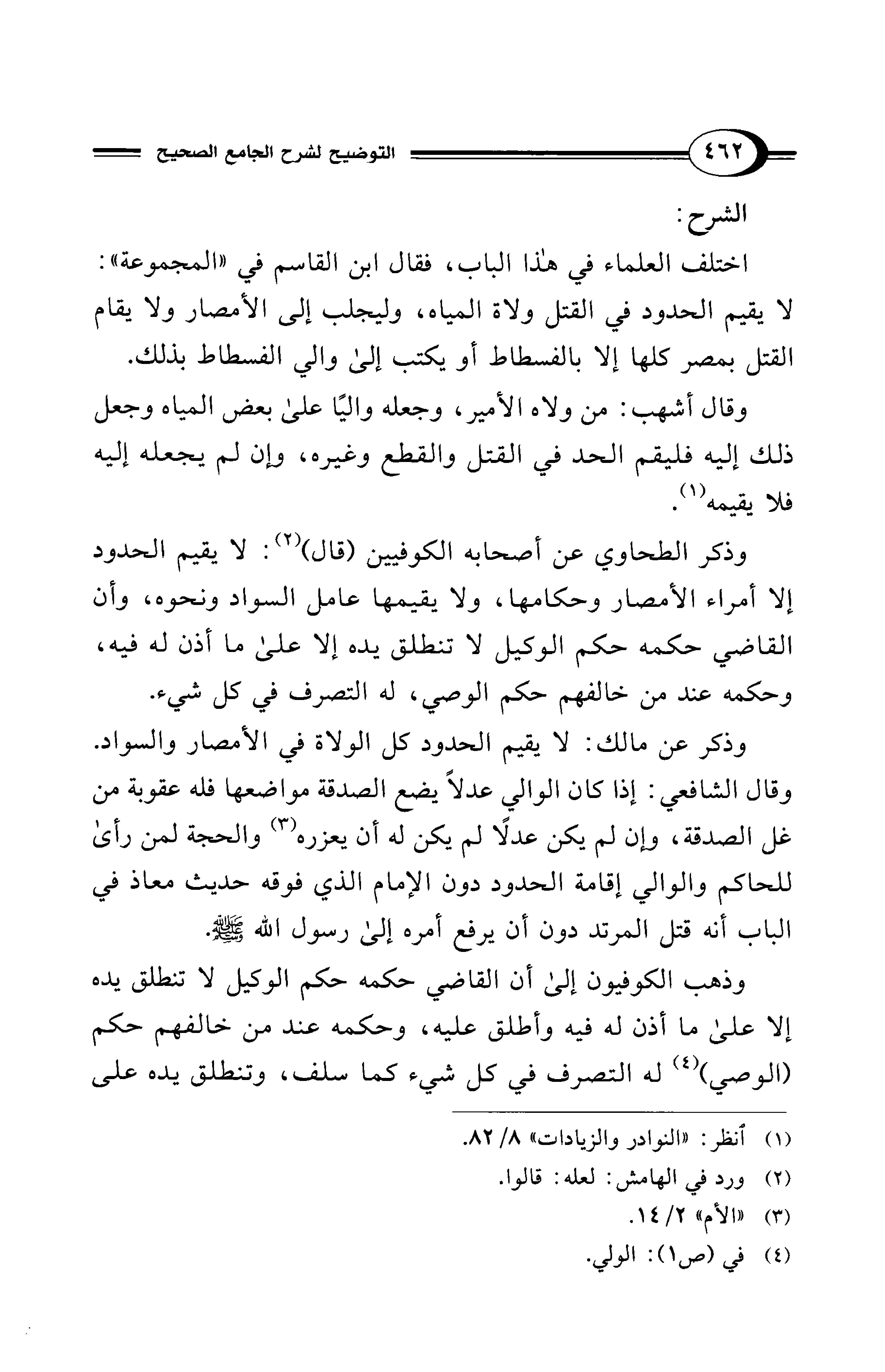 اختلف العلماء في هذا الباب، فقال ابن القاسم في "المجموعة": لا يقيم الحدود في القتل ولاة المياه، وليجلب إلى الأمصار ولا يقام القتل بمصر كلها إلا بالفسطاط أو يكتب إلى والي الفسطاط بذلك.
