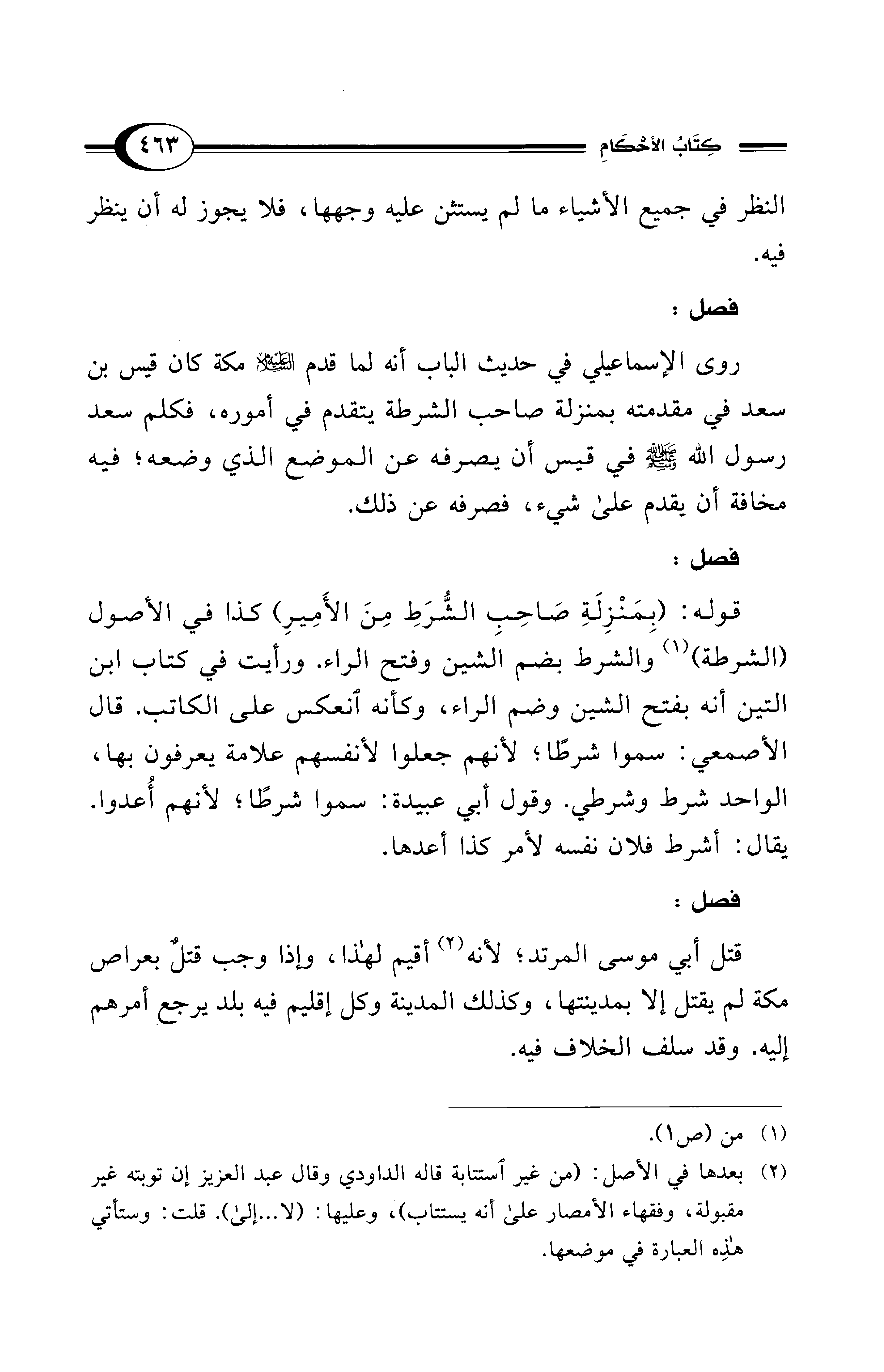 قوله: (بِمَنْزِلَةِ صَاحِبِ الشُّرَطِ مِنَ الأَمِيرِ) كذا في الأصول (الشرطة) (¬1) والشرط بضم الشين وفتح الراء. ورأيت في كتاب ابن التين أنه بفتح الشين وضم الراء، وكأنه انعكس على الكاتب. قال الأصمعي: سموا شرطًا؛ لأنهم جعلوا لأنفسهم علامة يعرفون بها، الواحد شرط وشرطي. وقول أبي عبيدة: سموا شرطًا؛ لأنهم أُعدوا. يقال: أشرط فلان نفسه لأمر كذا أعدها.
