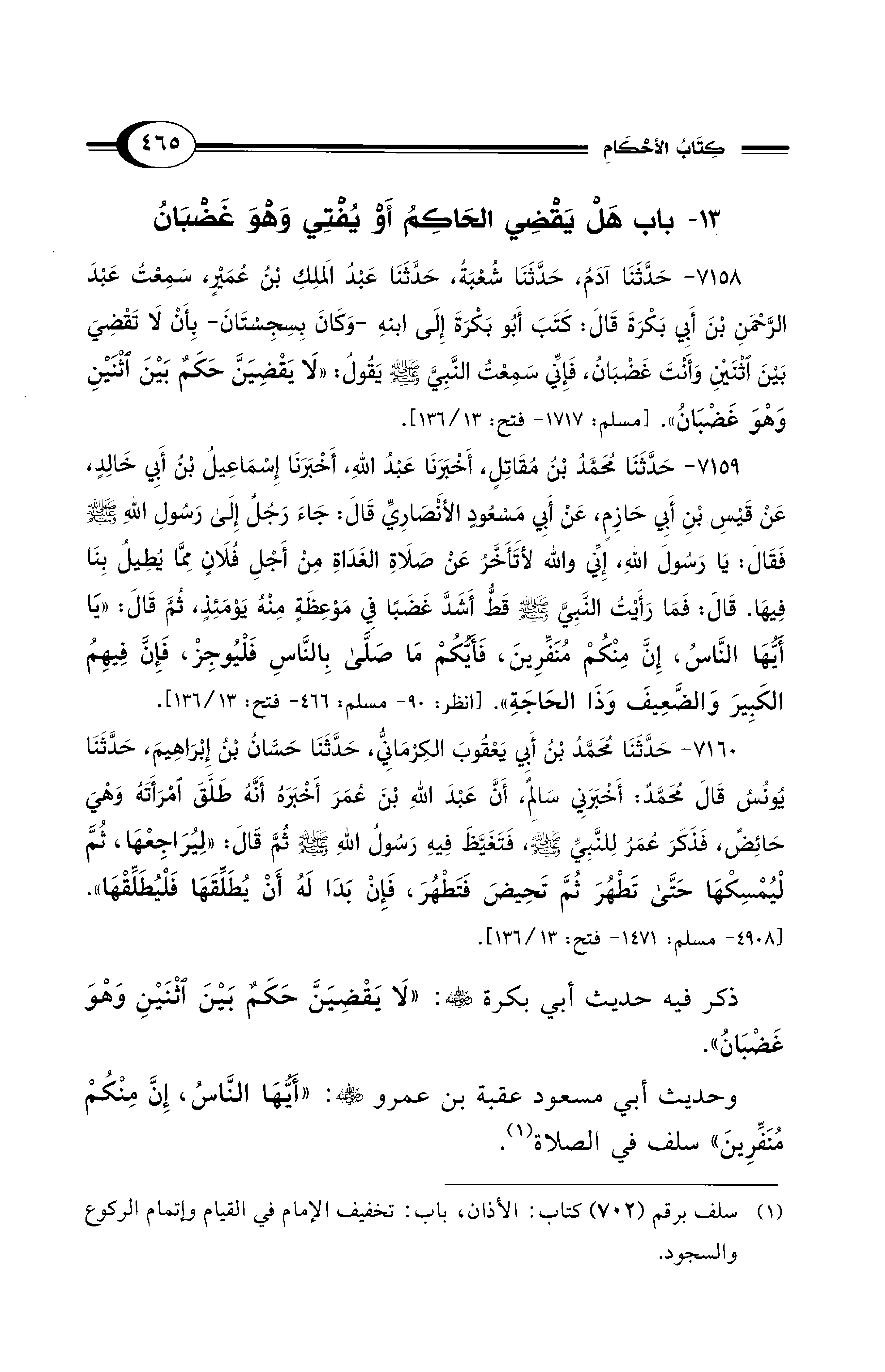 7158 - حَدَّثَنَا آدَمُ، حَدَّثَنَا شُعْبَةُ، حَدَّثَنَا عَبْدُ المَلِكِ بْنُ عُمَيْرٍ، سَمِعْتُ عَبْدَ الرَّحْمَنِ بْنَ أَبِي بَكْرَةَ قَالَ: كَتَبَ أَبُو بَكْرَةَ إِلَى ابْنِهِ -وَكَانَ بِسِجِسْتَانَ- بِأَنْ لاَ تَقْضِيَ بَيْنَ اثْنَيْنِ وَأَنْتَ غَضْبَانُ، فَإِنِّي سَمِعْتُ النَّبِيَّ - صلى الله عليه وسلم - يَقُولُ: «لاَ يَقْضِيَنَّ حَكَمٌ بَيْنَ اثْنَيْنِ وَهْوَ غَضْبَانُ». [مسلم: 1717 - فتح: 13/ 136].