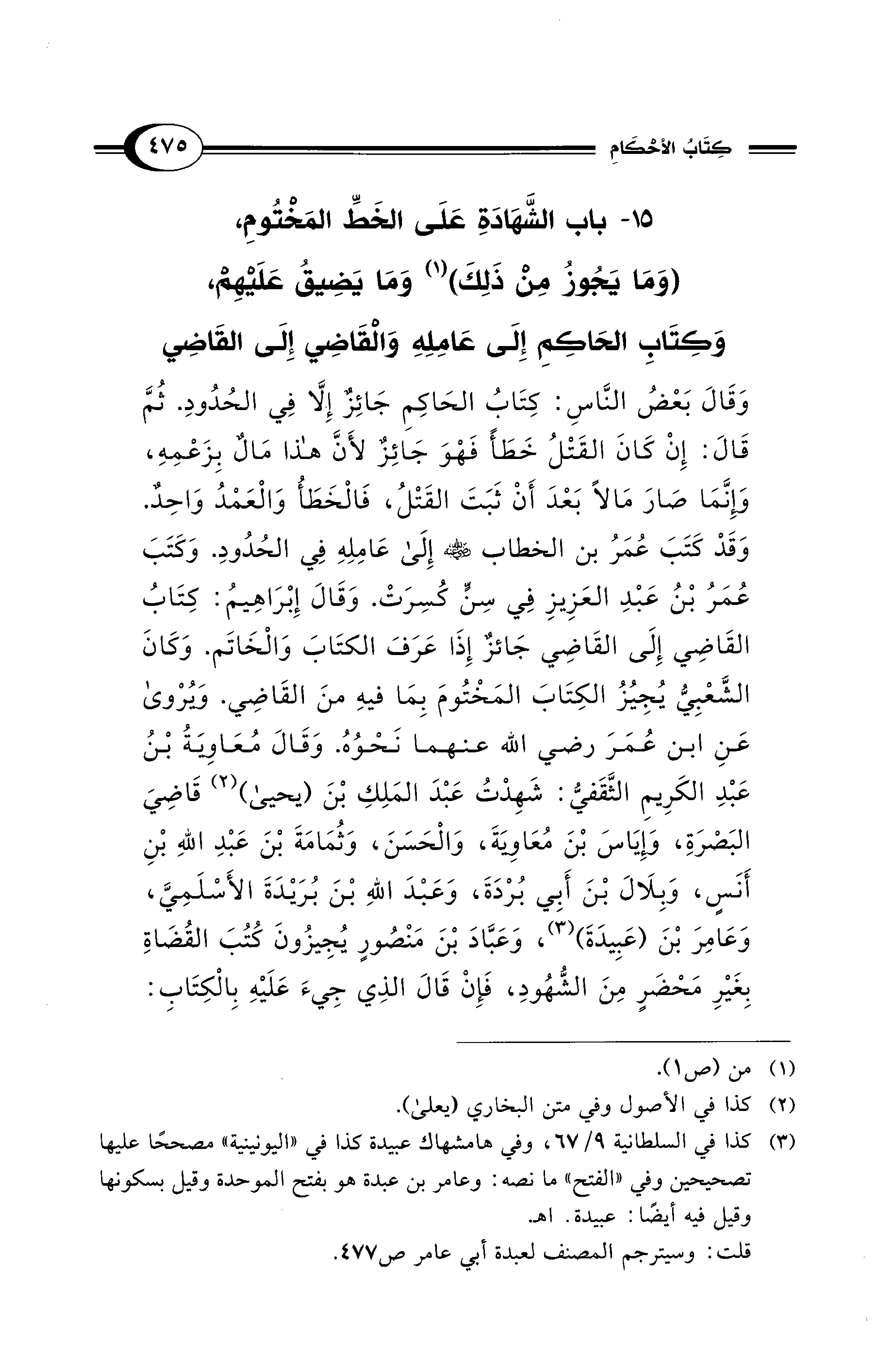 وَقَالَ بَعْضُ النَّاسِ: كِتَابُ الْحَاكِمِ جَائِزٌ إِلاَّ فِي الحُدُودِ. ثُمَّ قَالَ إِنْ كَانَ القَتْلُ خَطَأً فَهْوَ جَائِزٌ لأَنَّ هَذَا مَالٌ بِزَعْمِهِ، وَإِنَّمَا صَارَ مَالاً بَعْدَ أَنْ ثَبَتَ القَتْلُ، فَالْخَطَأُ وَالْعَمْدُ وَاحِدٌ. وَقَدْ كَتَبَ عُمَرُ بن الخطاب - رضي الله عنه - إِلَى عَامِلِهِ فِي الحُدُودِ. وَكَتَبَ عُمَرُ بْنُ عَبْدِ الْعَزِيزِ فِي سِنٍّ كُسِرَتْ. وَقَالَ إِبْرَاهِيمُ: كِتَابُ الْقَاضِى إِلَى الْقَاضِى جَائِزٌ إِذَا عَرَفَ الْكِتَابَ وَالْخَاتَمَ. وَكَانَ الشَّعْبِيُّ يُجِيزُ الكِتَابَ المَخْتُومَ بِمَا فِيهِ مِنَ الْقَاضِي. وَيُرْوَى عَنِ ابْنِ عُمَرَ - رضي الله عنهما - نَحْوُهُ. وَقَالَ مُعَاوِيَةُ بْنُ عَبْدِ الكَرِيمِ الثَّقَفِيُّ: شَهِدْتُ عَبْدَ المَلِكِ بْنَ (يحيي) (¬2) قَاضِيَ البَصْرَةِ، وَإِيَاسَ بْنَ مُعَاوِيَةَ، وَالْحَسَنَ، وَثُمَامَةَ بْنَ عَبْدِ اللهِ بْنِ أَنَسٍ، وَبِلاَلَ بْنَ أَبِي بُرْدَةَ، وَعَبْدَ اللهِ بْنَ بُرَيْدَةَ الأَسْلَمِيَّ، وَعَامِرَ بْنَ (عَبِيدَةَ) (¬3)، وَعَبَّادَ بْنَ مَنْصُورٍ يُجِيزُونَ كُتُبَ القُضَاةِ بِغَيْرِ مَحْضَرٍ مِنَ الشُّهُودِ، فَإِنْ قَالَ الَّذِي جِيءَ عَلَيْهِ بِالْكِتَابِ: