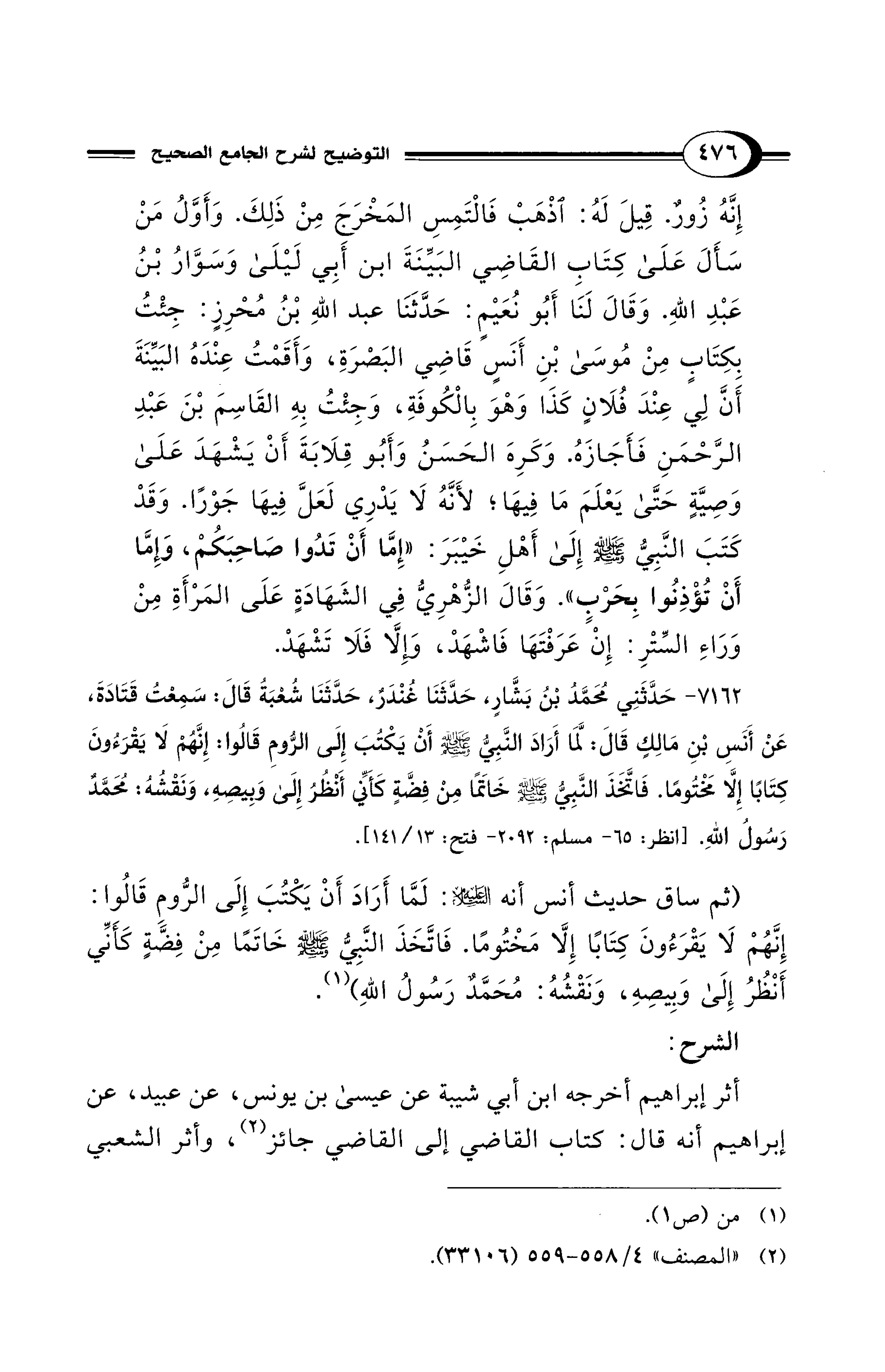 إِنَّهُ زُورٌ. قِيلَ لَهُ: اذْهَبْ فَالْتَمِسِ المَخْرَجَ مِنْ ذَلِكَ. وَأَوَّلُ مَنْ سَأَلَ عَلَى كِتَابِ القَاضِي البَيِّنَةَ ابْنُ أَبِي لَيْلَى وَسَوَّارُ بْنُ عَبْدِ اللهِ. وَقَالَ لَنَا أَبُو نُعَيْمٍ: حَدَّثَنَا عُبَيْدُ اللهِ بْنُ مُحْرِزٍ: جِئْتُ بِكِتَابٍ مِنْ مُوسَى بْنِ أَنَسٍ قَاضِى البَصْرَةِ، وَأَقَمْتُ عِنْدَهُ البَيِّنَةَ أَنَّ لِي عِنْدَ فُلاَنٍ كَذَا وَهْوَ بِالْكُوفَةِ، وَجِئْتُ بِهِ القَاسِمَ بْنَ عَبْدِ الرَّحْمَنِ فَأَجَازَهُ. وَكَرِهَ الحَسَنُ وَأَبُو قِلاَبَةَ أَنْ يَشْهَدَ عَلَى وَصِيَّةٍ حَتَّى يَعْلَمَ مَا فِيهَا؛ لأَنَّهُ لاَ يَدْرِي لَعَلَّ فِيهَا جَوْرًا. وَقَدْ كَتَبَ النَّبِيُّ - صلى الله عليه وسلم - إِلَى أَهْلِ خَيْبَرَ: «إِمَّا أَنْ تَدُوا صَاحِبَكُمْ، وَإِمَّا