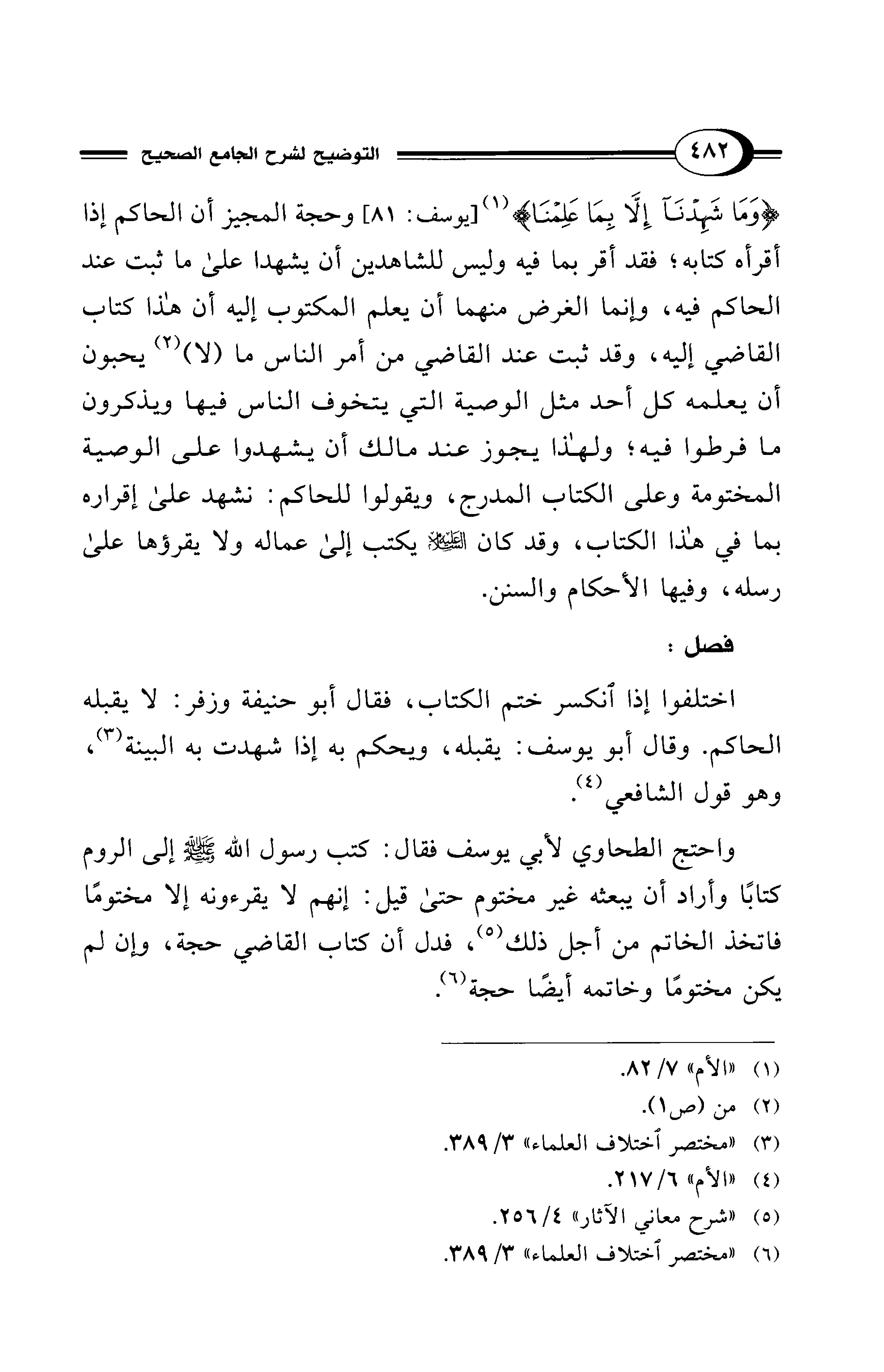 واحتج الطحاوي لأبي يوسف فقال: كتب رسول الله - صلى الله عليه وسلم - إلى الروم كتابًا وأراد أن يبعثه غير مختوم حتى قيل: إنهم لا يقرءونه إلا مختومًا فاتخذ الخاتم من أجل ذلك (¬5)، فدل أن كتاب القاضي حجة، وإن لم يكن مختومًا وخاتمه أيضًا حجة (¬6).