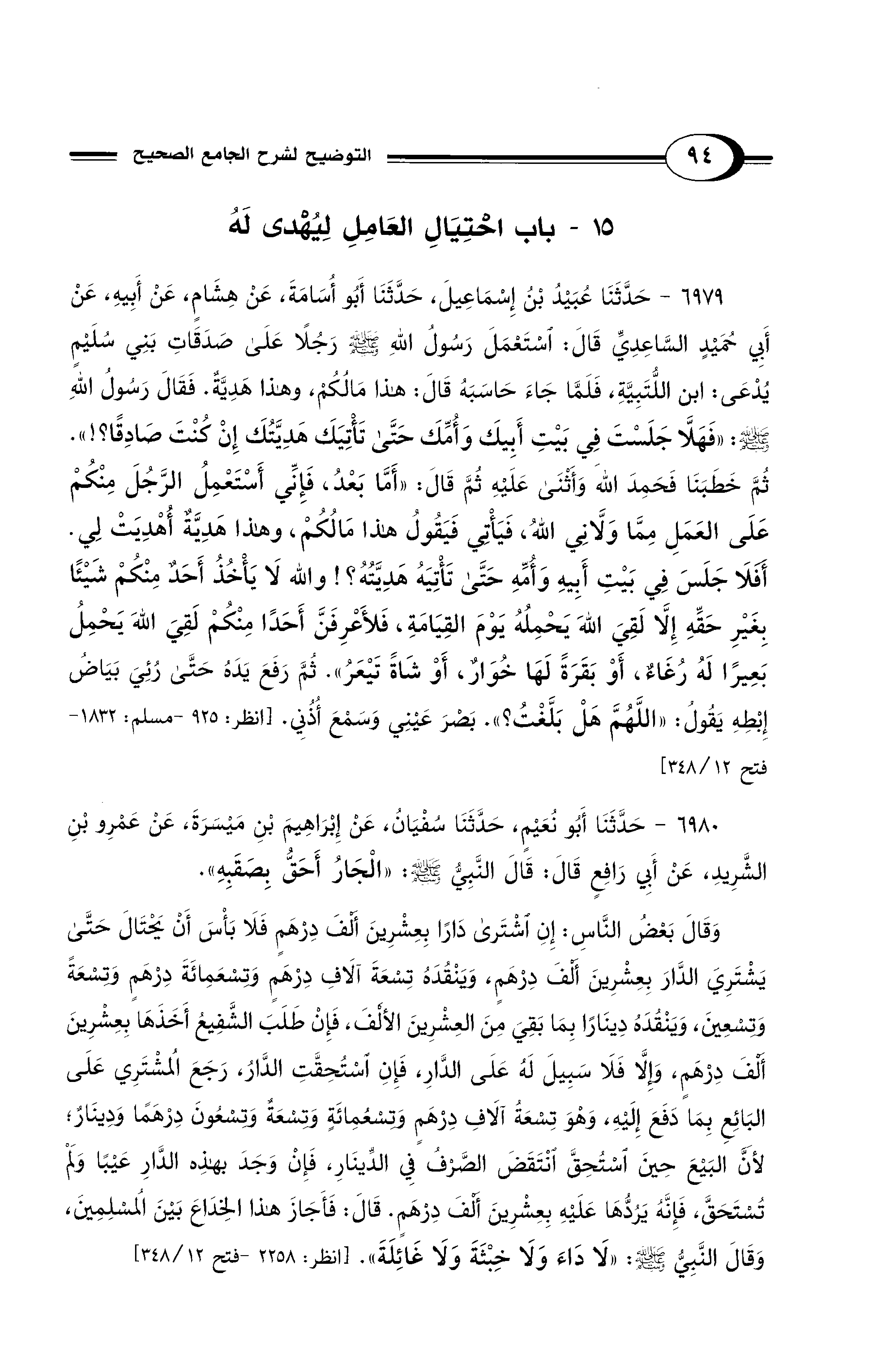 6979 - حَدَّثَنَا عُبَيْدُ بْنُ إِسْمَاعِيلَ، حَدَّثَنَا أَبُو أُسَامَةَ، عَنْ هِشَامٍ، عَنْ أَبِيهِ، عَنْ أَبِي حُمَيْدٍ السَّاعِدِيِّ قَالَ: اسْتَعْمَلَ رَسُولُ اللهِ - صلى الله عليه وسلم - رَجُلاً عَلَى صَدَقَاتِ بَنِي سُلَيْمٍ يُدْعَى: ابْنَ اللُّتَبِيَّةِ، فَلَمَّا جَاءَ حَاسَبَهُ قَالَ: هَذَا مَالُكُمْ وَهَذَا هَدِيَّةٌ. فَقَالَ رَسُولُ اللهِ - صلى الله عليه وسلم -: «فَهَلاَّ جَلَسْتَ فِي بَيْتِ أَبِيكَ وَأُمِّكَ، حَتَّى تَأْتِيَكَ هَدِيَّتُكَ إِنْ كُنْتَ صَادِقًا؟!». ثُمَّ خَطَبَنَا فَحَمِدَ اللهَ وَأَثْنَى عَلَيْهِ ثُمَّ قَالَ: «أَمَّا بَعْدُ، فَإِنِّي أَسْتَعْمِلُ الرَّجُلَ مِنْكُمْ عَلَى الْعَمَلِ مِمَّا وَلاَّنِى اللهُ، فَيَأْتِي فَيَقُولُ هَذَا مَالُكُمْ، وَهَذَا هَدِيَّةٌ أُهْدِيَتْ لِي. أَفَلاَ جَلَسَ فِي بَيْتِ أَبِيهِ وَأُمِّهِ حَتَّى تَأْتِيَهُ هَدِيَّتُهُ؟!، وَاللهِ لاَ يَأْخُذُ أَحَدٌ مِنْكُمْ شَيْئًا بِغَيْرِ حَقِّهِ، إِلاَّ لَقِيَ اللهَ يَحْمِلُهُ يَوْمَ الْقِيَامَةِ، فَلأَعْرِفَنَّ أَحَدًا مِنْكُمْ لَقِيَ اللهَ يَحْمِلُ بَعِيرًا لَهُ رُغَاءٌ، أَوْ بَقَرَةً لَهَا خُوَارٌ، أَوْ شَاةً تَيْعَرُ». ثُمَّ رَفَعَ يَدَهُ حَتَّى رُئِيَ بَيَاضُ إِبْطِهِ يَقُولُ: «اللَّهُمَّ هَلْ بَلَّغْتُ؟». بَصْرَ عَيْنِي وَسَمْعَ أُذُنِي. [انظر: 125 - مسلم: 1832 - فتح 12/ 348]
