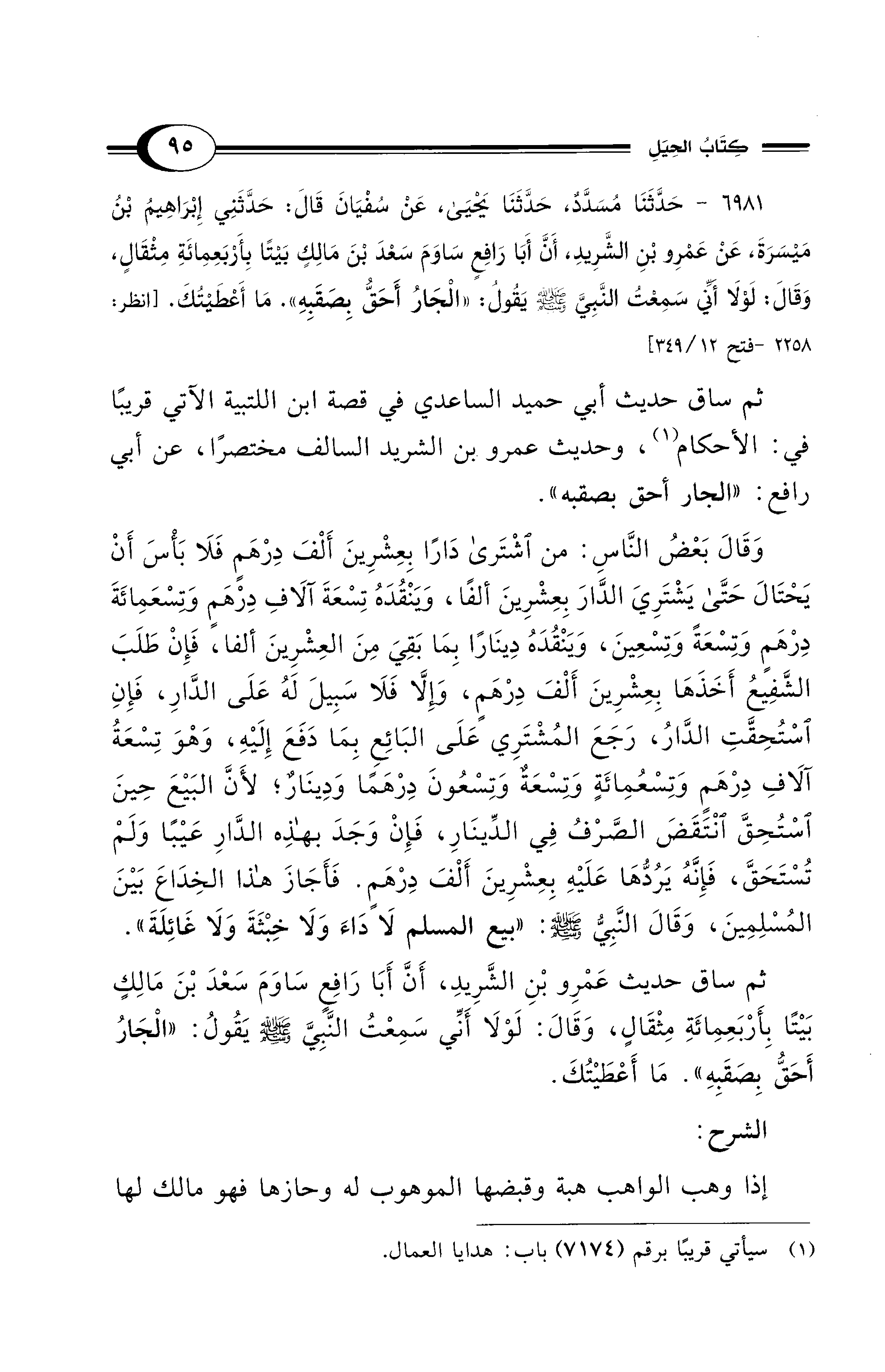 ثم ساق حديث عَمْرِو بْنِ الشَّرِيدِ، أَنَّ أَبَا رَافِعٍ سَاوَمَ سَعْدَ بْنَ مَالِكٍ بَيْتًا بِأَرْبَعِمِائَةِ مِثْقَالٍ، وَقَالَ: لَوْلَا أَنِّي سَمِعْتُ النَّبِيَّ - صلى الله عليه وسلم - يَقُولُ: "الْجَارُ أَحَقُّ بِصَقَبِهِ". مَا أَعْطَيْتُكَ.