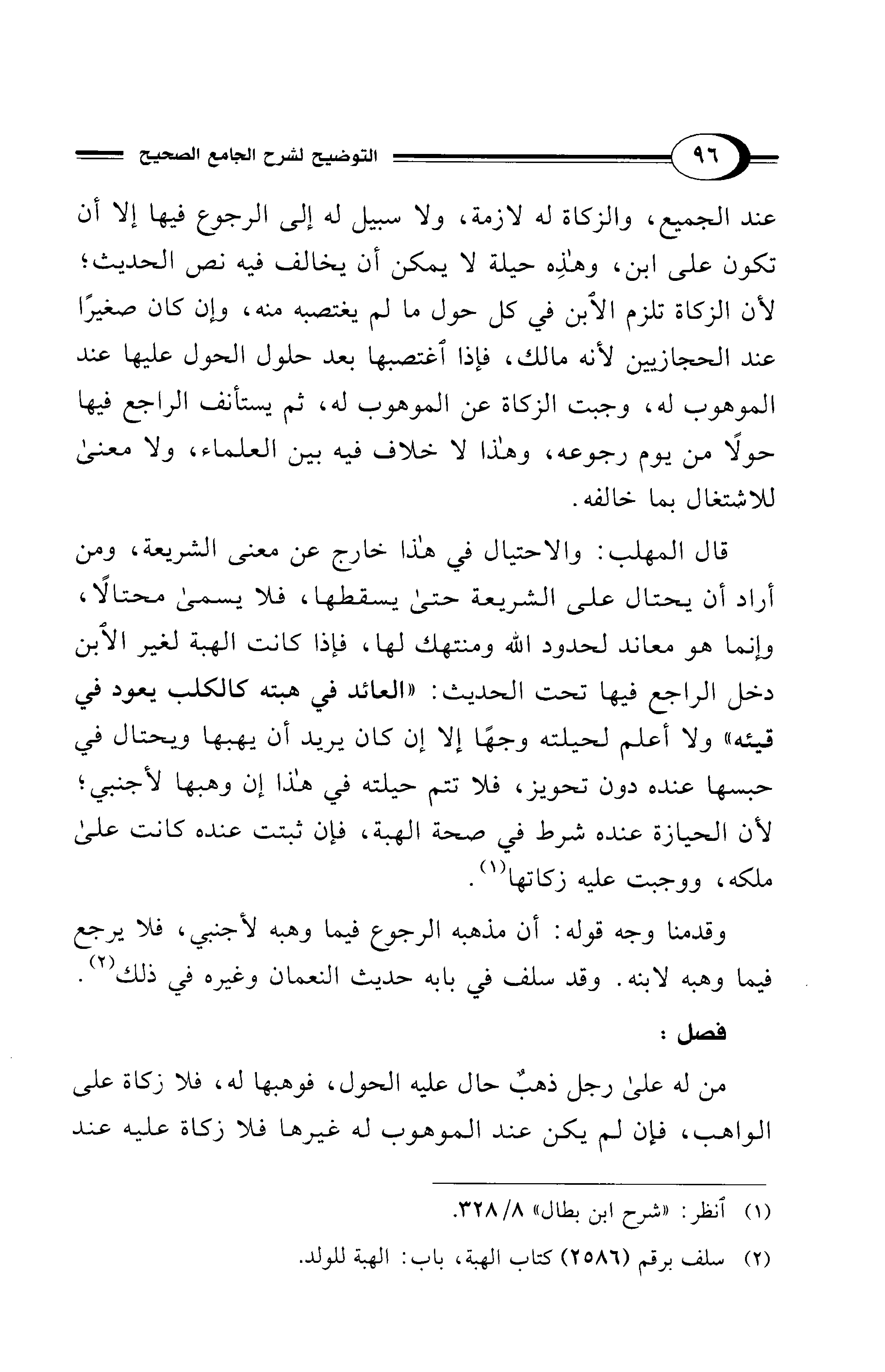 قال المهلب: والاحتيال في هذا خارج عن معنى الشريعة، ومن أراد أن يحتال على الشريعة حتى يسقطها، فلا يسمى محتالاً، وإنما هو معاند لحدود الله ومنتهك لها، فإذا كانت الهبة لغير الابن دخل الراجع فيها تحت الحديث: "العائد في هبته كالكلب يعود في قيئه"ولا أعلم لحيلته وجهًا إلا إن كان يريد أن يهبها ويحتال في حبسها عنده دون تحويز، فلا تتم حيلته في هذا إن وهبها لأجنبي؛ لأن الحيازة عنده شرط في صحة الهبة، فإن ثبتت عنده كانت على ملكه، ووجبت عليه زكاتها (¬1).