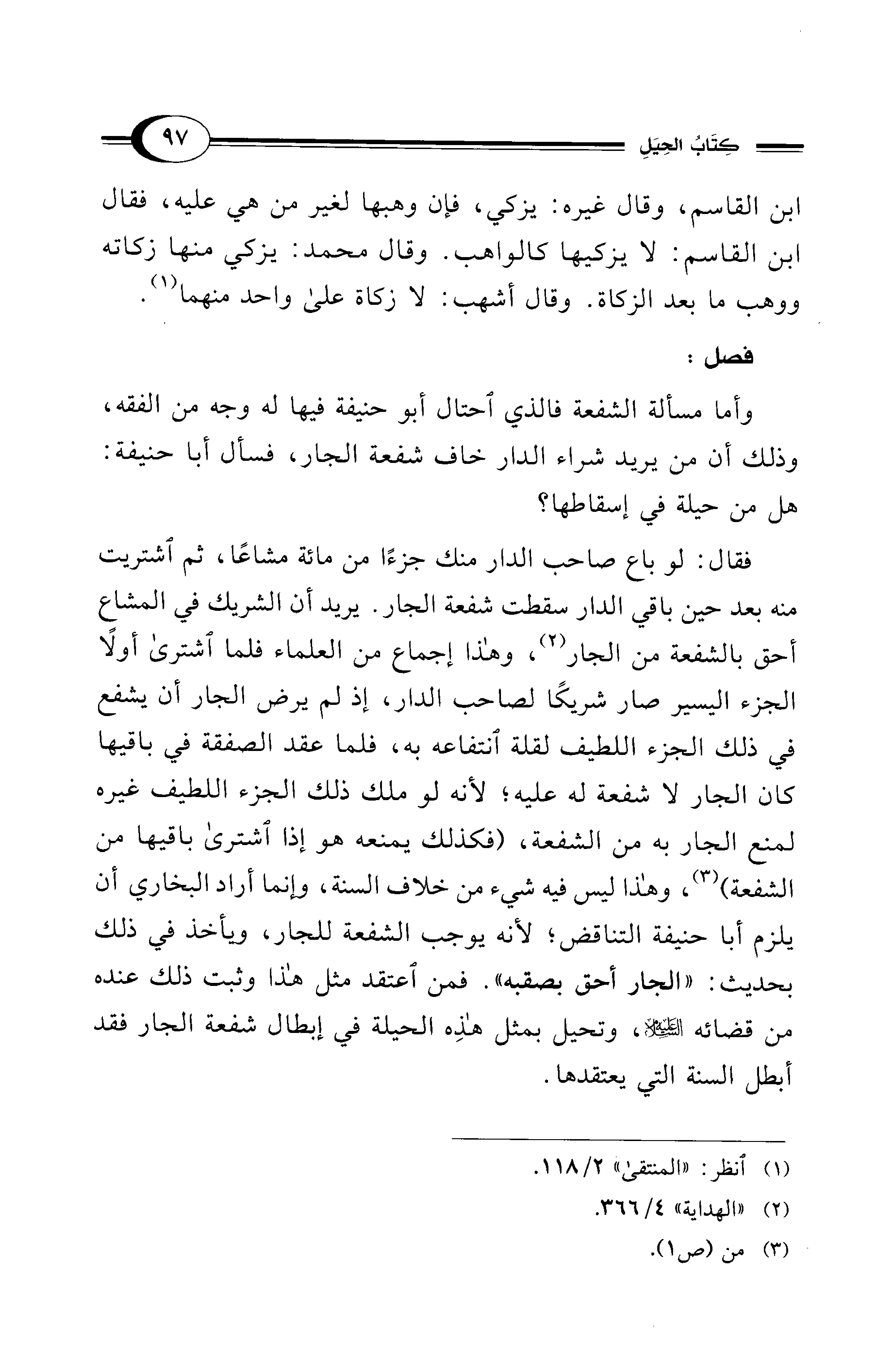 فقال: لو باع صاحب الدار منك جزءًا من مائة مشاعًا، ثم اشتريت منه بعد حين باقي الدار سقطت شفعة الجار. يريد أن الشريك في المشاع أحق بالشفعة من الجار (¬2)، وهذا إجماع من العلماء فلما اشترى أولاً الجزء اليسير صار شريكًا لصاحب الدار، إذ لم يرض الجار أن يشفع في ذلك الجزء اللطيف لقلة انتفاعه به، فلما عقد الصفقة في باقيها كان الجار لا شفعة له عليه؛ لأنه لو ملك ذلك الجزء اللطيف غيره لمنع الجار به من الشفعة، (فكذلك يمنعه هو إذا اشترى باقيها من الشفعة) (¬3)، وهذا ليس فيه شيء من خلاف السنة، وإنما أراد البخاري أن يلزم أبا حنيفة التناقض؛ لأنه يوجب الشفعة للجار، ويأخذ في ذلك بحديث: "الجار أحق بصقبه". فمن اعتقد مثل هذا وثبت ذلك عنده من قضائه - عليه السلام -، وتحيل بمثل هذِه الحيلة في إبطال شفعة الجار فقد أبطل السنة التي يعتقدها.