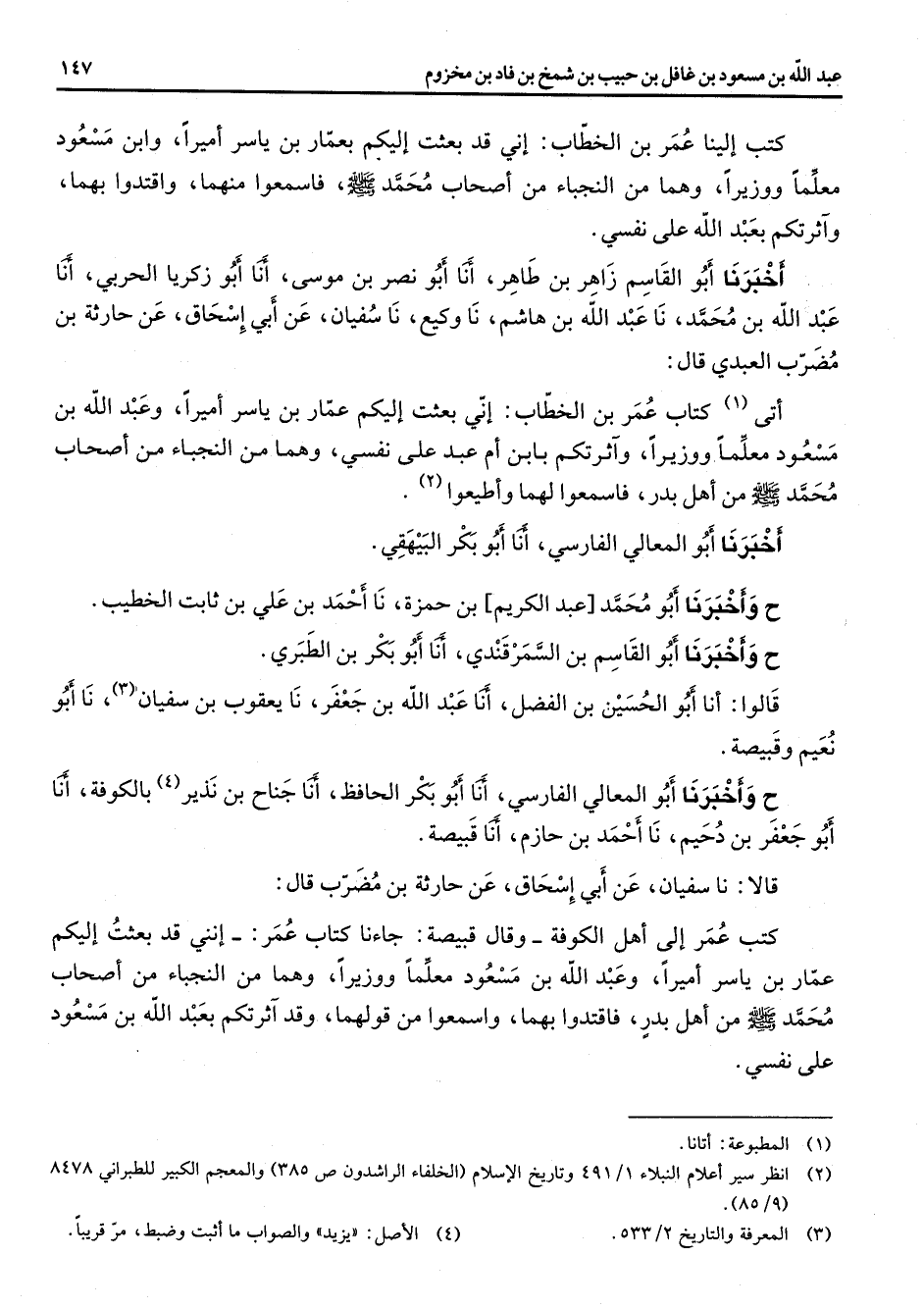 كتب إلينا عمر بن الخطاب إني قد بعثت إليكم بعمار بن ياسر أميرا وابن مسعود معلما ووزيرا وهما من النجباء من أصحاب محمد (صلى الله عليه وسلم) فاسمعوا منهما واقتدوا بهما وآثرتكم بعبد الله على نفسي أخبرنا أبو القاسم زاهر بن طاهر أنا أبو نصر بن موسى أنا أبو زكريا الحربي أنا عبد الله بن محمد نا عبد الله بن هاشم نا وكيع نا سفيان عن أبي إسحاق عن حارثة بن مضرب العبدي قال أتى (1) كتاب عمر بن الخطاب إني بعثت إليكم عمار بن ياسر أميرا وعبد الله بن مسعود معلما ووزيرا وآثرتكم بابن أم عبد على نفسي وهما من النجباء من أصحاب محمد (صلى الله عليه وسلم) من أهل بدر فاسمعوا لهما وأطيعوا (2) أخبرنا أبو المعالي الفارسي أنا أبو بكر البيهقي ح وأخبرنا أبو محمد عبد الكريم بن حمزة أنا أحمد بن علي بن ثابت الخطيب ح وأخبرنا أبو القاسم بن السمرقندي أنا أبو بكر بن الطبري قالوا أنا أبو الحسين بن الفضل أنا عبد الله بن جعفر نا يعقوب بن سفيان (3) نا أبو نعيم وقبيصة ح وأخبرنا أبو المعالي الفارسي أنا أبو بكر الحافظ أنا جناح بن نذير (4) بالكوفة أنا أبو جعفر بن دحيم نا أحمد بن حازم أنا قبيصة قالا نا سفيان عن أبي إسحاق عن حارثة بن مضرب قال كتب عمر إلى أهل الكوفة وقال قبيصة جاءنا كتاب عمر إنني قد بعثت إليكم عمار بن ياسر أميرا وعبد الله بن مسعود معلما ووزيرا وهما من النجباء من أصحاب محمد (صلى الله عليه وسلم) من أهل بدر فاقتدوا بهما واسمعوا من قولهما وقد آثرتكم بعبد الله بن مسعود