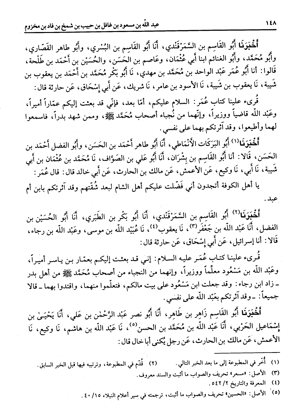 على نفسي أخبرنا أبو القاسم بن السمرقندي أنا أبو القاسم بن البسري وأبو طاهر القصاري وأبو محمد وأبو الغنائم ابنا أبي عثمان وعاصم بن الحسن والحسين بن أحمد بن طلحة قالوا أنا أبو عمر عبد الواحد بن محمد بن مهدي نا أبو بكر محمد بن أحمد بن يعقوب بن شيبة نا يعقوب بن شيبة نا الأسود بن عامر نا شريك عن أبي إسحاق عن حارثة قال قرئ علينا كتاب عمر السلام عليكم أما بعد فإني قد بعثت إليكم عمارا أميرا وعبد الله قاضيا ووزيرا وإنهما من نجباء أصحاب محمد (صلى الله عليه وسلم) وممن شهد بدرا فاسمعوا لهما وأطيعوا وقد آثرتكم بهما على نفسي أخبرنا (1) أبو البركات الأنماطي أنا أبو طاهر أحمد بن الحسن وأبو الفضل أحمد بن الحسن قالا أنا أبو القاسم بن بشران أنا أبو علي بن الصواف نا محمد بن عثمان بن أبي شيبة نا أبي نا وكيع عن الأعمش عن مالك بن الحارث عن أبي خالد قال قال عمر يا أهل الكوفة أتجدون أني فضلت عليكم أهل الشام لبعد شقتهم وقد آثرتكم بابن أم عبد أخبرنا (2) أبو القاسم بن السمرقندي أنا أبو بكر بن الطبري أنا أبو الحسين بن الفضل أنا عبد الله بن جعفر (3) نا يعقوب (4) نا عبيد الله بن موسى وعبد الله بن رجاء قالا أنا إسرائيل عن أبي إسحاق عن حارثة قال قرئ علينا كتاب عمر عليه السلام إني قد بعثت إليكم بعمار بن ياسر أميرا وعبد الله بن مسعود معلما ووزيرا وإنهما من النجباء من أصحاب محمد (صلى الله عليه وسلم) من أهل بدر زاد ابن رجاء وقد جعلت ابن مسعود على بيت مالكم فتعلموا منهما واقتدوا بهما قالا جميعا وقد آثرتكم بعبد الله على نفسي أخبرنا أبو القاسم زاهر بن طاهر أنا أبو نصر عبد الرحمن بن علي أنا يحيى بن إسماعيل الحربي أنا عبد الله بن محمد بن الحسن (5) نا عبد الله بن هاشم نا وكيع نا الأعمش عن مالك بن الحارث عن رجل يكنى أبا خال قال