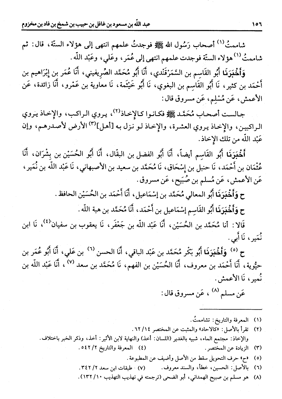 شاممت (1) أصحاب رسول الله (صلى الله عليه وسلم) فوجدت علمهم انتهى إلى هؤلاء الستة قال ثم شاممت (1) هؤلاء الستة فوجدت علمهم انتهى إلى عمر وعلي وعبد الله وأخبرنا أبو القاسم بن السمرقندي أنا أبو محمد الصريفيني أنا عمر بن إبراهيم بن أحمد بن كثير نا أبو القاسم بن البغوي نا أبو خيثمة نا معاوية بن عمرو أنا زائدة عن الأعمش عن مسلم عن مسروق قال جالست أصحاب محمد (صلى الله عليه وسلم) فكانوا كالإخاذ (2) يروي الراكب والإخاذ يروي الراكبين والإخاذ يروي العشرة والإخاذ لو نزل به أهل (3) الأرض لأصدرهم وإن عبد الله من تلك الإخاذ أخبرنا أبو القاسم أيضا أنا أبو الفضل بن البقال أنا أبو الحسين بن بشران أنا عثمان بن أحمد نا حنبل بن إسحاق نا محمد بن سعيد بن الأصبهاني نا عبد الله بن نمير عن الأعمش عن مسلم بن صبيح عن مسروق ح وأخبرنا أبو المعالي محمد بن إسماعيل أنا أحمد بن الحسين الحافظ ح وأخبرنا أبو القاسم إسماعيل بن أحمد أنا محمد بن هبة الله قالا أنا محمد بن الحسين أنا عبد الله بن جعفر نا يعقوب بن سفيان (4) نا ابن نمير نا أبي ح (5) وأخبرنا أبو بكر محمد بن عبد الباقي أنا الحسن (6) بن علي أنا أبو عمر بن حيوية أنا أحمد بن معروف أنا الحسين بن الفهم نا محمد بن سعد (7) أنا عبد الله بن نمير نا الأعمش عن مسلم (8) عن مسروق قال