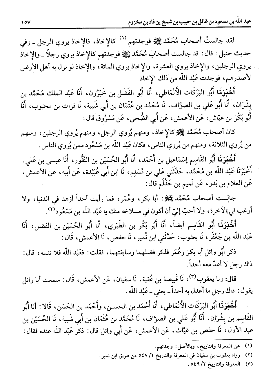 لقد جالست أصحاب محمد (صلى الله عليه وسلم) فوجدتهم (1) كالإخاذ فالإخاذ يروي الرجل وفي حديث حنبل قال قد جالست أصحاب محمد (صلى الله عليه وسلم) فوجدتهم كالإخاذ يروي رجلا والإخاذ يروي الرجلين والإخاذ يروي العشرة والإخاذ يروي المائة والإخاذ لو نزل به أهل الأرض لأصدرهم فوجدت عبد الله من ذلك الإخاذ أخبرنا أبو البركات الأنماطي أنا أبو الفضل بن خيرون أنا عبد الملك محمد بن بشران أنا أبو علي بن الصواف نا محمد بن عثمان بن أبي شيبة نا فرات بن محبوب أنا أبو بكر بن عياش عن الأعمش عن أبي الضحى عن مسروق قال كان أصحاب محمد (صلى الله عليه وسلم) كالإخاذ ومنهم يروي الرجل ومنهم يروي الرجلين ومنهم من يروي الثلاثة ومنهم من يروي الناس فكان عبد الله بن مسعود ممن يروي الناس أخبرنا أبو القاسم إسماعيل بن أحمد أنا أبو الحسين بن النقور أنا عيسى بن علي أخبرنا عبد الله بن محمد حدثني علي بن مسلم نا ابن أبي عبيدة عن أبيه عن الأعمش عن العلاء بن بدر عن تميم بن حذلم قال جالست أصحاب محمد (صلى الله عليه وسلم) أبا بكر وعمر فما رأيت أحدا أزهد في الدنيا ولا أرغب في الآخرة ولا أحب إلي أن أكون في مسلاخه منك يا عبد الله بن مسعود (2) أخبرنا أبو القاسم أيضا أنا أبو بكر بن الطبري أنا أبو الحسين بن الفضل أنا عبد الله بن جعفر نا يعقوب حدثني ابن نمير نا حفص نا الأعمش قال ذكر أبو وائل أبا بكر وعمر فذكر فضلهما وسابقتهما فقلت فعبد الله فلا تنسه قال داك رجل لا أعد معه أحدا قال ونا يعقوب (3) نا قبيصة بن عقبة نا سفيان عن الأعمش قال سمعت أبا وائل يقول ذاك رجل ما أعدل به أحدا يعني عبد الله أخبرنا أبو البركات الأنماطي أنا أحمد بن الحسن وأحمد بن الحسن قالا أنا أبو القاسم بن بشران أنا أبو علي بن الصواف نا محمد بن عثمان بن أبي شيبة نا الحسين بن عبد الأول نا حفص بن غياث عن الأعمش عن أبي وائل قال ذكر عبد الله عنده فقال