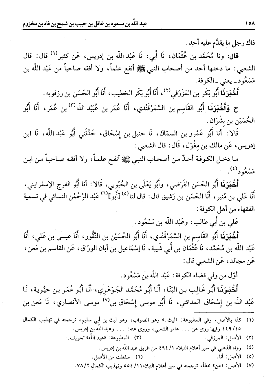 ذاك رجل ما يقدم عليه أحد قال ونا محمد بن عثمان نا أبي نا عبد الله بن إدريس عن كثير (1) قال قال الشعبي ما دخلها أحد من أصحاب النبي (صلى الله عليه وسلم) أنفع علما ولا أفقه صاحبا من عبد الله بن مسعود يعني الكوفة أخبرنا أبو بكر بن المزرفي (2) أنا أبو بكر الخطيب أنا أبو الحسن بن رزقويه ح وأخبرنا أبو القاسم بن السمرقندي أنا عمر بن عبيد الله (3) بن عمر أنا أبو الحسين بن بشران قالا أنا أبو عمرو بن السماك نا حنبل بن إسحاق حدثني أبو عبد الله نا ابن إدريس عن مالك بن مغول قال قال الشعبي ما دخل الكوفة أحد من أصحاب النبي (صلى الله عليه وسلم) أنفع علما ولا أفقه صاحبا من ابن مسعود (4) أخبرنا أبو الحسن الفرضي وأبو يعلى بن الحبوبي قالا أنا أبو الفرج الإسفرايني أنا علي بن منير أنا الحسن بن رشيق قال قال لنا (5) أبو (6) عبد الرحمن النسائي في تسمية الفقهاء من أهل الكوفة علي بن أبي طالب وعبد الله بن مسعود أخبرنا أبو القاسم بن السمرقندي أنا أبو الحسين بن النقور أنا عيسى بن علي أنا عبد الله بن محمد نا عثمان بن أبي شيبة نا إسماعيل بن أبان الوراق عن القاسم بن معن عن مجالد عن الشعبي قال أول من ولي قضاء الكوفة عبد الله بن مسعود أخبرنا أبو غالب بن البنا أنا أبو محمد الجوهري أنا أبو عمر بن حيوية نا عبد الله بن إسحاق المدائني نا أبو موسى إسحاق بن (7) موسى الأنصاري نا معن بن