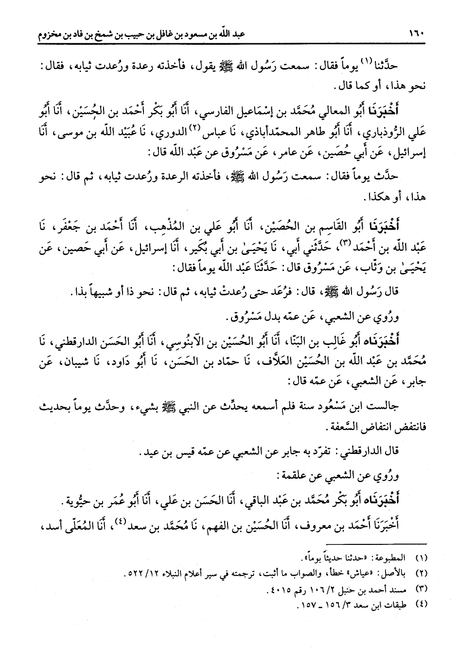 حدثنا (1) يوما فقال سمعت رسول الله (صلى الله عليه وسلم) يقول فأخذته رعدة ورعدت ثيابه فقال نحو هذا أو كما قال أخبرنا أبو المعالي محمد بن إسماعيل الفارسي أنا أبو بكر أحمد بن الحسين أنا أبو علي الروذباري أنا أبو طاهر المحمدأباذي نا عباس (2) الدوري نا عبيد الله بن موسى أنا إسرائيل عن أبي حصين عن عامر عن مسروق عن عبد الله قال حدث يوما فقال سمعت رسول الله (صلى الله عليه وسلم) فأخذته الرعدة ورعدت ثيابه ثم قال نحو هذا أو هكذا أخبرنا أبو القاسم بن الحصين أنا أبو علي بن المذهب أنا أحمد بن جعفر نا عبد الله بن أحمد (3) حدثني أبي نا يحيى بن أبي بكير أنا إسرائيل عن أبي حصين عن يحيى بن وثاب عن مسروق قال حدثنا عبد الله يوما فقال قال رسول الله (صلى الله عليه وسلم) قال فرعد حتى رعدت ثيابه ثم قال نحو ذا أو شبيها بذا وروي عن الشعبي عن عمه بدل مسروق أخبرناه أبو غالب بن البنا أنا أبو الحسين بن الآبنوسي أنا أبو الحسن الدراقطني نا محمد بن عبد الله بن الحسين العلاف نا حماد بن الحسن نا أبو داود نا شيبان عن جابر عن الشعبي عن عمه قال جالست ابن مسعود سنة فلم أسمعه يحدث عن النبي (صلى الله عليه وسلم) بشئ وحدث يوما بحديث فانتفض انتفاض السعفة قال الدارقطني تفرد به جابر عن الشعبي عن عمه قيس بن عيد وروي عن الشعبي عن علقمة أخبرناه أبو بكر محمد بن عبد الباقي أنا الحسن بن علي أنا أبو عمر بن حيوية أخبرنا أحمد بن معروف أنا الحسين بن الفهم نا محمد بن سعد (4) أنا المعلى أسد