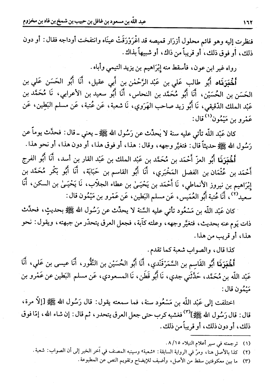 فنظرت إليه وهو قائم محلول أزرار قميصه قد اغرورقت عيناه وانتفخت أوداجه فقال أو دون ذلك أو فوق ذلك أو قريبا من ذاك أو شبيها بذاك رواه غير ابن عون فأسقط منه إبراهيم بن يزيد التيمي وأباه أخبرناه أبو طالب علي بن عبد الرحمن بن أبي عقيل أنا أبو الحسن علي بن الحسن بن الحسين أنا أبو محمد بن النحاس أنا أبو سعيد بن الأعرابي نا محمد بن عبد الملك الدقيقي نا أبو زيد صاحب الهروي نا شعبة عن عتبة عن مسلم البطين عن عمرو بن ميمون (1) قال كان عبد الله تأتي عليه سنة لا يحدث عن رسول الله (صلى الله عليه وسلم) يعني قال فحدث يوما عن رسول الله (صلى الله عليه وسلم) فتغير وجهه وقال هذا أو فوق هذا أو دون هذا أو نحو هذا أخبرنا أبو العز أحمد بن محمد بن عبد الملك بن عبد القار بن أسد أنا أبو الفرج أحمد بن عثمان بن الفضل المخبري أنا أبو القاسم بن حبابة أنا أبو بكر محمد بن إبراهيم بن نيروز الأنماطي نا أحمد بن يحيى بن عطاء الجلاب نا يحيى بن السكن أنا سعيد (2) أنا عتبة أبو العميس عن مسلم البطين عن عمرو بن ميمون قال كان عبد الله بن مسعود تأتي عليه السنة لا يحدث عن رسول الله (صلى الله عليه وسلم) بحديث فحدث ذات يوم عنه بحديث فتغير وجهه وعلته كآبة فجعل العرق يتحدر من جبهته ويقول نحو هذا أو قريب من هذا كذا قال والصواب شعبة كما تقدم أخبرنا أبو القاسم بن السمرقندي أنا أبو الحسين بن النقور أنا عيسى بن علي أنا عبد الله بن محمد حدثني جدي نا أبو قطن نا المسعودي عن مسلم البطين عن عمرو بن ميمون قال اختلفت إلى عبد الله بن مسعود سنة فما سمعته يقول قال رسول الله (صلى الله عليه وسلم) إلا مرة قال قال رسول الله (صلى الله عليه وسلم) (3) فغشيه كرب حتى جعل العرق يتحدر ثم قال إن شاء الله إما فوق ذلك أو دون ذلك أو قريبا من ذلك