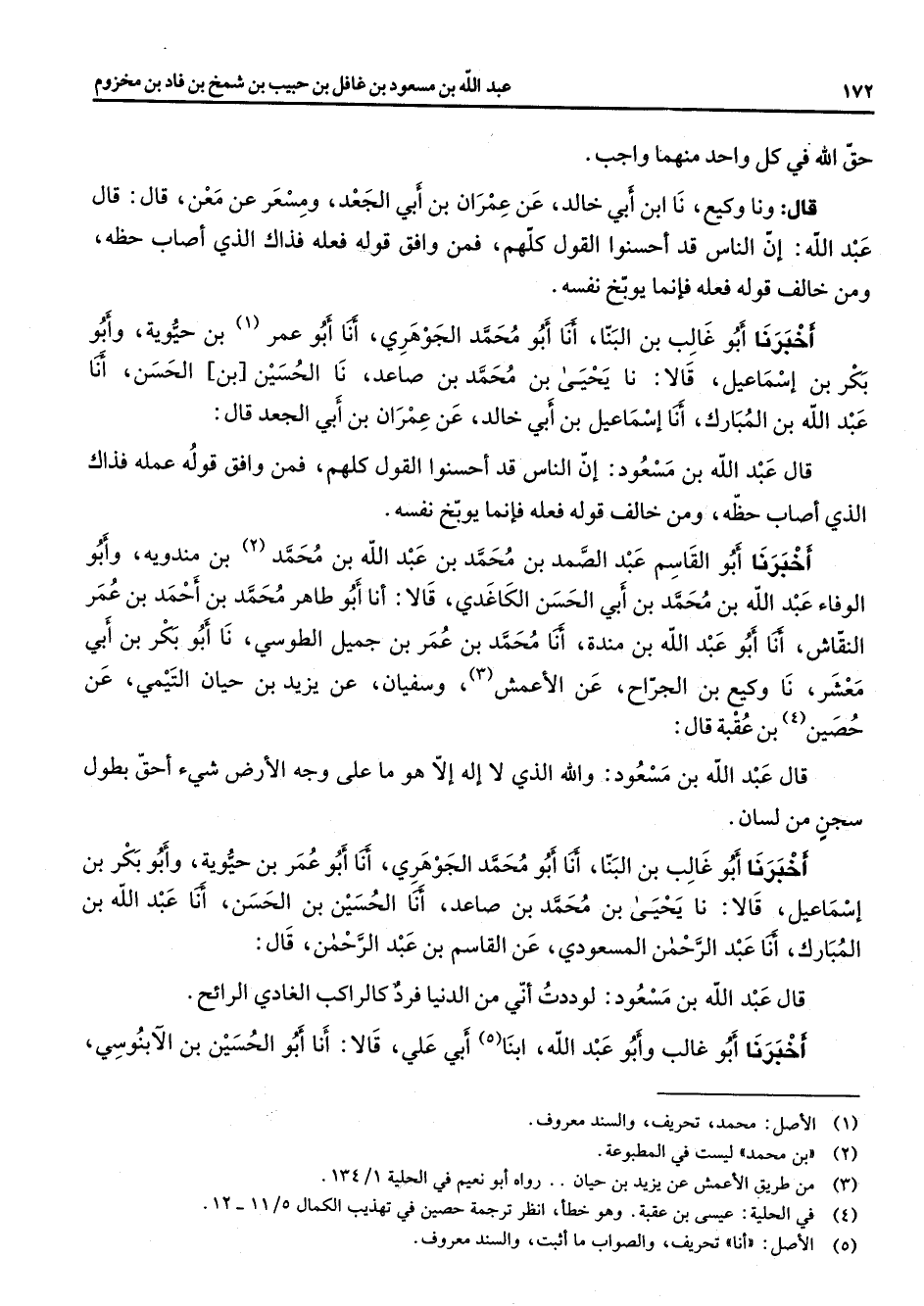 حق الله في كل واحد منهما واجب قال ونا وكيع نا ابن أبي خالد عن عمران بن أبي الجعد ومسعر عن معن قال قال عبد الله إن الناس قد أحسنوا القول كلهم فمن وافق قوله فعله فذاك الذي أصاب حظه ومن خالف قوله فعله فإنما يوبخ نفسه أخبرنا أبو غالب بن البنا أنا أبو محمد الجوهري أنا أبو (1) عمر بن حيوية وأبو بكر بن إسماعيل قالا نا يحيى بن محمد بن صاعد نا الحسين بن الحسن أنا عبد الله بن المبارك أنا إسماعيل بن أبي خالد عن عمران بن أبي الجعد قال قال عبد الله بن مسعود إن الناس قد أحسنوا القول كلهم فمن وافق قوله عمله فذاك الذي أصاب حظه ومن خالف قوله فعله فإنما يوبخ نفسه أخبرنا أبو القاسم عبد الصمد بن محمد بن عبد الله بن محمد (2) بن مندويه وأبو الوفاء عبد الله بن محمد بن أبي الحسن الكاغدي قالا أنا أبو طاهر محمد بن أحمد بن عمر النقاش أنا أبو عبد الله بن مندة أنا محمد بن عمر بن جميل الطوسي نا أبو بكر بن أبي معشر نا وكيع بن الجراح عن الأعمش (3) وسفيان عن يزيد بن حيان التيمي عن حصين (4) بن عقبة قال قال عبد الله بن مسعود والله الذي لا إله إلا هو ما على وجه الأرض شئ أحق بطول سجن من لسان أخبرنا أبو غالب بن البنا أنا أبو محمد الجوهري أنا أبو عمر بن حيوية وأبو بكر بن إسماعيل قالا نا يحيى بن محمد بن صاعد أنا الحسين بن الحسن أنا عبد الله بن المبارك أنا عبد الرحمن المسعودي عن القاسم بن عبد الرحمن قال قال عبد الله بن مسعود لوددت أني من الدنيا فرد كالراكب الغادي الرائح أخبرنا أبو غالب وأبو عبد الله ابنا (5) أبي علي قالا أنا أبو الحسين بن الآبنوسي