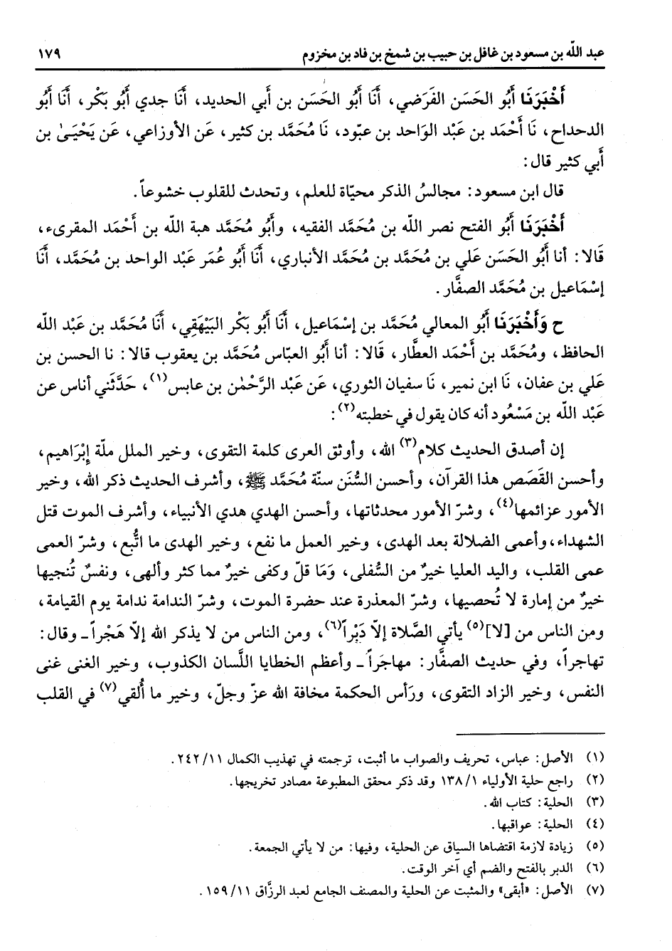 أخبرنا أبو الحسن الفرضي أنا أبو الحسن بن أبي الحديد أنا جدي أبو بكر أنا أبو الدحداح نا أحمد بن عبد الواحد بن عبود نا محمد بن كثير عن الأوزاعي عن يحيى بن أبي كثير قال قال ابن مسعود مجالس الذكر محياة للعلم وتحدث للقلوب خشوعا أخبرنا أبو الفتح نصر الله بن محمد الفقيه وأبو محمد هبة الله بن أحمد المقرئ قالا أنا أبو الحسن علي بن محمد بن محمد الأنباري أنا أبو عمر عبد الواحد بن محمد أنا إسماعيل بن محمد الصفار ح وأخبرنا أبو المعالي محمد بن إسماعيل أنا أبو بكر البيهقي أنا محمد بن عبد الله الحافظ ومحمد بن أحمد العطار قالا أنا أبو العباس محمد بن يعقوب قالا نا الحسن بن علي بن عفان نا ابن نمير نا سفيان الثوري عن عبد الرحمن بن عابس (1) حدثني أناس عن عبد الله بن مسعود أنه كان يقول في خطبته (2) إن أصدق الحديث كلام (3) الله وأوثق العرى كلمة التقوى وخير الملل ملة إبراهيم وأحسن القصص هذا القرآن وأحسن السنن سنة محمد (صلى الله عليه وسلم) وأشرف الحديث ذكر الله وخير الأمور عزائمها (4) وشر الأمور محدثاتها وأحسن الهدي هدي الأنبياء وأشرف الموت قتل الشهداء وأعمى الضلالة بعد الهدى وخير العمل ما نفع وخير الهدى ما اتبع وشر العمى عمى القلب واليد العليا خير من السفلى وما قل وكفى خير مما كثر وألهى ونفس تنجيها خير من إمارة لا تحصيها وشر المعذرة عند حضرة الموت وشر الندامة ندامة يوم القيامة ومن الناس من لا (5) يأتي الصلاة إلا دبرا (6) ومن الناس من لا يذكر الله إلا هجرا وقال تهاجرا وفي حديث الصفار مهاجرا وأعظم الخطايا اللسان الكذوب وخير الغنى غنى النفس وخير الزاد التقوى ورأس الحكمة مخافة الله عوجل وخير ما ألقي (7) في القلب