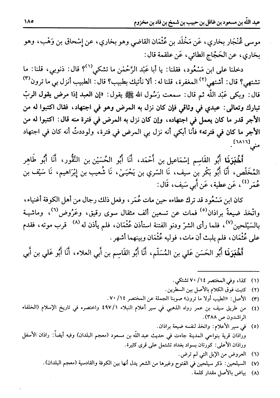 موسى غنجار بخاري عن مخلد بن عثمان القاضي وهو بخاري عن إسحاق بن وهب وهو بخاري عن الحجاج الطائي عن علقمة قال دخلنا على ابن مسعود فقلنا يا أبا عبد الرحمن ما تشكي (1) قال ذنوبي قلنا ما تشتهي قال أشتهي (2) المغفرة قلنا له ألا نأتيك بطبيب قال الطبيب أنزل بي ما ترون (3) قال وبكى عبد الله ثم قال سمعت رسول الله (صلى الله عليه وسلم) يقول إن العبد إذا مرض يقول الرب تبارك وتعالى عبدي في وثاقي فإن كان نزل به المرض وهو في اجتهاد فقال اكتبوا له من الأجر قدر ما كان يعمل في اجتهاده وإن كان نزل به المرض في فترة منه قال اكتبوا له من الأجر ما كان في فترته فأنا أبكي أنه نزل بي المرض في فترة ولوددت أنه كان في اجتهاد مني أخبرنا أبو القاسم إسماعيل بن أحمد أنا أبو الحسين بن النقور أنا أبو طاهر المخلص أنا أبو بكر بن سيف نا السري بن يحيى نا شعيب بن إبراهيم نا سيف بن عمر (4) عن عطية عن أبي سيف قال كان ابن مسعود قد ترك عطاءه حين مات عمر وفعل ذلك رجال من أهل الكوفة أغنياء واتخذ ضيعة براذان (5) فمات عن تسعين ألف مثقال سوى رقيق وعروض (6) وماشية بالسيلحين (7) فلما رأى الشر ودنو الفتنة استأذن عثمان فلم يأذن له (8) قرب موته فقدم على عثمان فلم يلبث أن مات فوليه عثمان وبينهما أشهر أخبرنا أبو الحسن علي بن المسلم أنا أبو القاسم بن أبي العلاء أنا أبو علي بن أبي