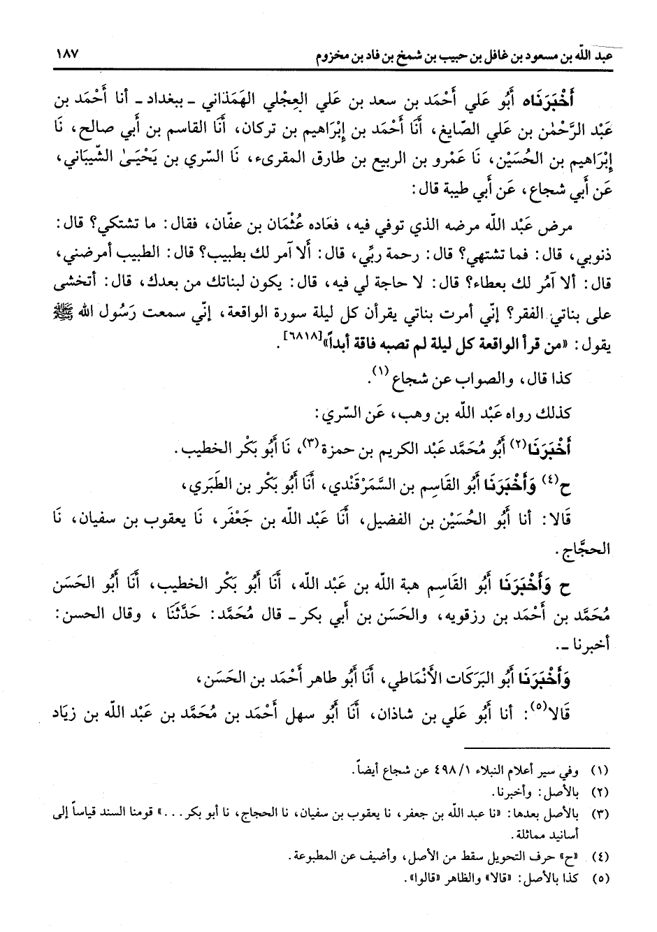 أخبرناه أبو علي أحمد بن سعد بن علي العجلي الهمذاني ببغداد أنا أحمد بن عبد الرحمن بن علي الصايغ أنا أحمد بن إبراهيم بن تركان أنا القاسم بن أبي صالح نا إبراهيم بن الحسين نا عمرو بن الربيع بن طارق المقرئ نا السري بن يحيى الشيباني عن أبي شجاع عن أبي طيبة قال مرض عبد الله مرضه الذي توفي فيه فعاده عثمان بن عفان فقال ما تشتكي قال ذنوبي قال فما تشتهي قال رحمة ربي قال ألا آمر لك بطبيب قال الطبيب أمرضني قال ألا آمر لك بعطاء قال لا حاجة لي فيه قال يكون لبناتك من بعدك قال أتخشى على بناتي الفقر إني أمرت بناتي يقرأن كل ليلة سورة الواقعة إني سمعت رسول الله (صلى الله عليه وسلم) يقول من قرأ الواقعة كل ليلة لم تصبه فاقة أبدا كذا قال والصواب عن شجاع (1) كذلك رواه عبد الله بن وهب عن السري أخبرنا (2) أبو محمد عبد الكريم بن حمزة (3) نا أبو بكر الخطيب ح (4) وأخبرنا أبو القاسم بن السمرقندي أنا أبو بكر بن الطبري قالا أنا أبو الحسين بن الفضيل أنا عبد الله بن جعفر نا يعقوب بن سفيان نا الحجاج ح وأخبرنا أبو القاسم هبة الله بن عبد الله أنا أبو بكر الخطيب أنا أبو الحسن محمد بن أحمد بن رزقويه والحسن بن أبي بكر قال محمد حدثنا وقال الحسن أخبرنا وأخبرنا أبو البركات الأنماطي أنا أبو طاهر أحمد بن الحسن قالا (5) أنا أبو علي بن شاذان أنا أبو سهل أحمد بن محمد بن عبد الله بن زياد