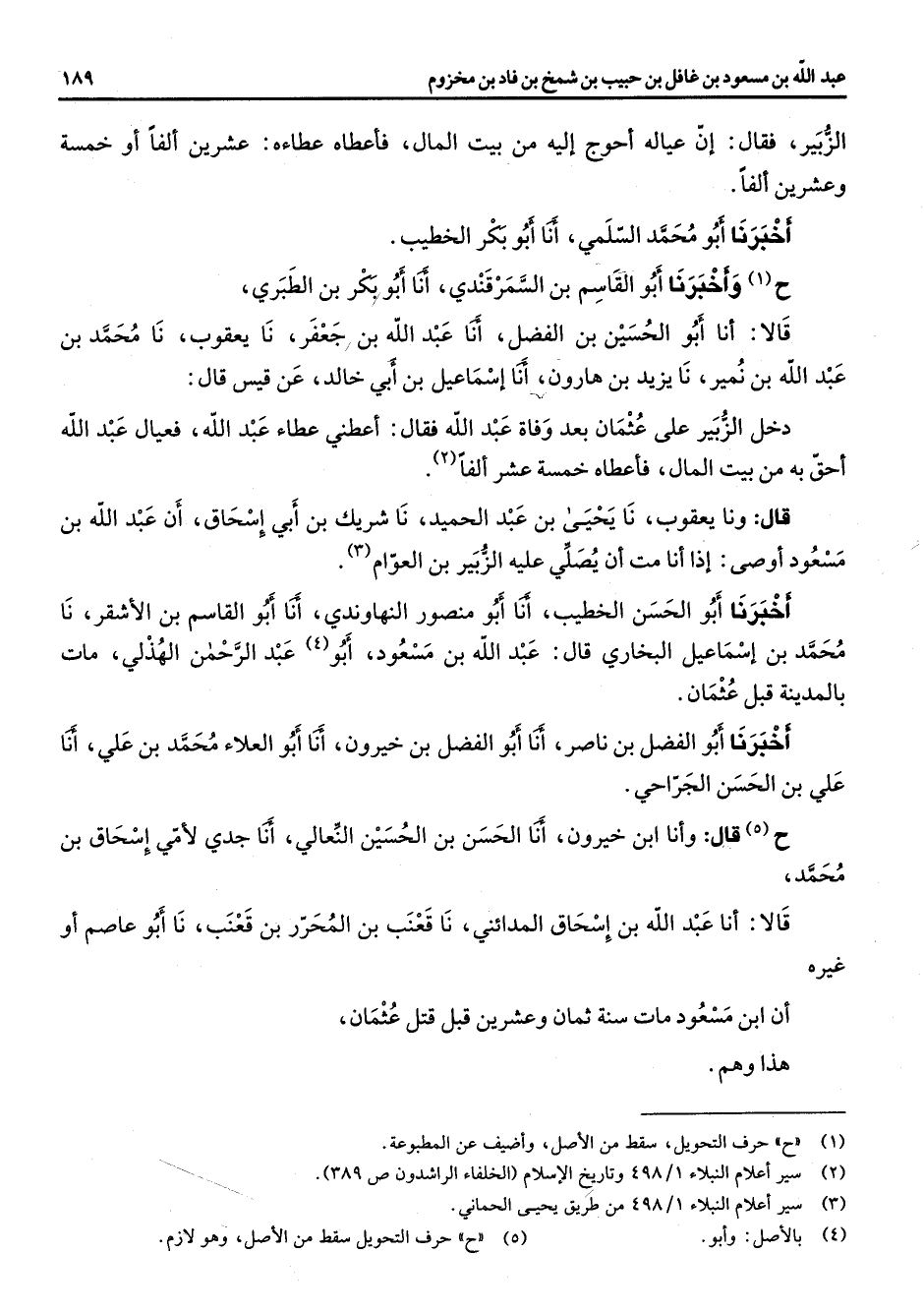 الزبير فقال إن عياله أحوج إليه من بيت المال فأعطاه عطاءه عشرين ألفا أو خمسة وعشرين ألفا أخبرنا أبو محمد السلمي أنا أبو بكر الخطيب ح (1) وأخبرنا أبو القاسم بن السمرقندي أنا أبو بكر بن الطبري قالا أنا أبو الحسين الفضل أنا عبد الله بن جعفر نا يعقوب نا محمد بن عبد الله بن نمير نا يزيد بن هارون أنا إسماعيل بن أبي خالد عن قيس قال دخل الزبير على عثمان بعد وفاة عبد الله فقال أعطني عطاء عبد الله فعيال عبد الله أحق به من بيت المال فأعطاه خمسة عشر ألفا (2) قال ونا يعقوب نا يحيى بن عبد الحميد نا شريك بن أبي إسحاق أن عبد الله بن مسعود أوصى إذا أنا مت أن يصلي عليه الزبير بن العوام (3) أخبرنا أبو الحسن الخطيب أنا أبو منصور النهاوندي أنا أبو القاسم بن الأشقر نا محمد بن إسماعيل البخاري قال عبد الله بن مسعود أبو (4) عبد الرحمن الهذلي مات با لمدينة قبل عثمان أخبرنا أبو الفضل بن ناصر أنا أبو الفضل بن خيرون أنا أبو العلاء محمد بن علي أنا علي بن الحسن الجراحي ح (5) قال وأنا ابن خيرون أنا الحسن بن الحسين النعالي أنا جدي لأمي إسحاق بن محمد قالا أنا عبد الله بن إسحاق المدائني نا قعنب بن المحرر بن قعنب نا أبو عاصم أو غيره أن ابن مسعود مات سنة ثمان وعشرين قبل قتل عثمان هذا وهم