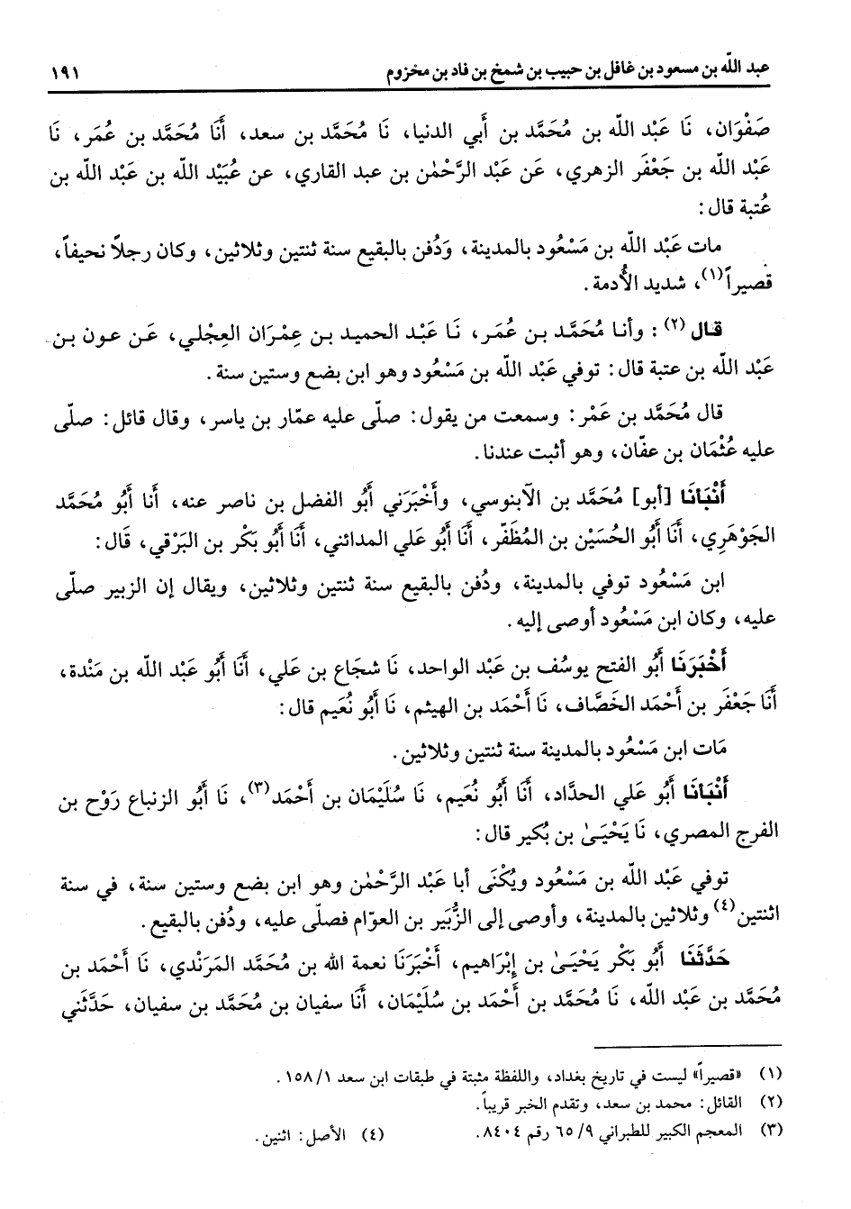 صفوان نا عبد الله بن محمد بن أبي الدنيا نا محمد بن سعد أنا محمد بن عمر نا عبد الله بن جعفر الزهري عن عبد الرحمن بن عبد القاري عن عبيد الله بن عبد الله بن عتبة قال مات عبد الله بن مسعود بالمدينة ودفن بالبقيع سنة ثنتين وثلاثين وكان رجلا نحيفا قصيرا (1) شديد الأدمة قال (2) وأنا محمد بن عمر نا عبد الحميد بن عمران العجلي عن عون بن عبد الله بن عتبة قال توفي عبد الله بن مسعود وهو ابن بضع وستين سنة قال محمد بن عمر وسمعت من يقول صلى عليه عمار بن ياسر وقال قائل صلى عليه عثمان بن عفان وهو أثبت عندنا أنبأنا أبو محمد بن الآبنوسي وأخبرني أبو الفضل بن ناصر عنه أنا أبو محمد الجوهري أنا أبو الحسين بن المظفر أنا أبو علي المدائني أنا أبو بكر بن البرقي قال ابن مسعود توفي بالمدينة ودفن بالبقيع سنة ثنتين وثلاثين ويقال إن الزبير صلى عليه وكان ابن مسعود أوصى إليه أخبرنا أبو الفتح يوسف بن عبد الواحد نا شجاع بن علي أنا أبو عبد الله بن مندة أنا جعفر بن أحمد الخصاف أنا أحمد بن الهيثم نا أبو نعيم قال مات ابن مسعود بالمدينة سنة ثنتين وثلاثين أنبأنا أبو علي الحداد أنا أبو نعيم نا سليمان بن أحمد (3) نا أبو الزنباع روح بن الفرج المصري نا يحيى بن بكير قال توفي عبد الله بن مسعود ويكنى أبا عبد الرحمن وهو ابن بضع وستين سنة في سنة اثنتين (4) وثلاثين بالمدينة وأوصى إلى الزبير بن العوام فصلى عليه ودفن بالبقيع حدثنا أبو بكر يحيى بن إبراهيم أخبرنا نعمة الله بن محمد المرندي نا أحمد بن محمد بن عبد الله نا محمد بن أحمد بن سليمان أنا سفيان بن محمد بن سفيان حدثني