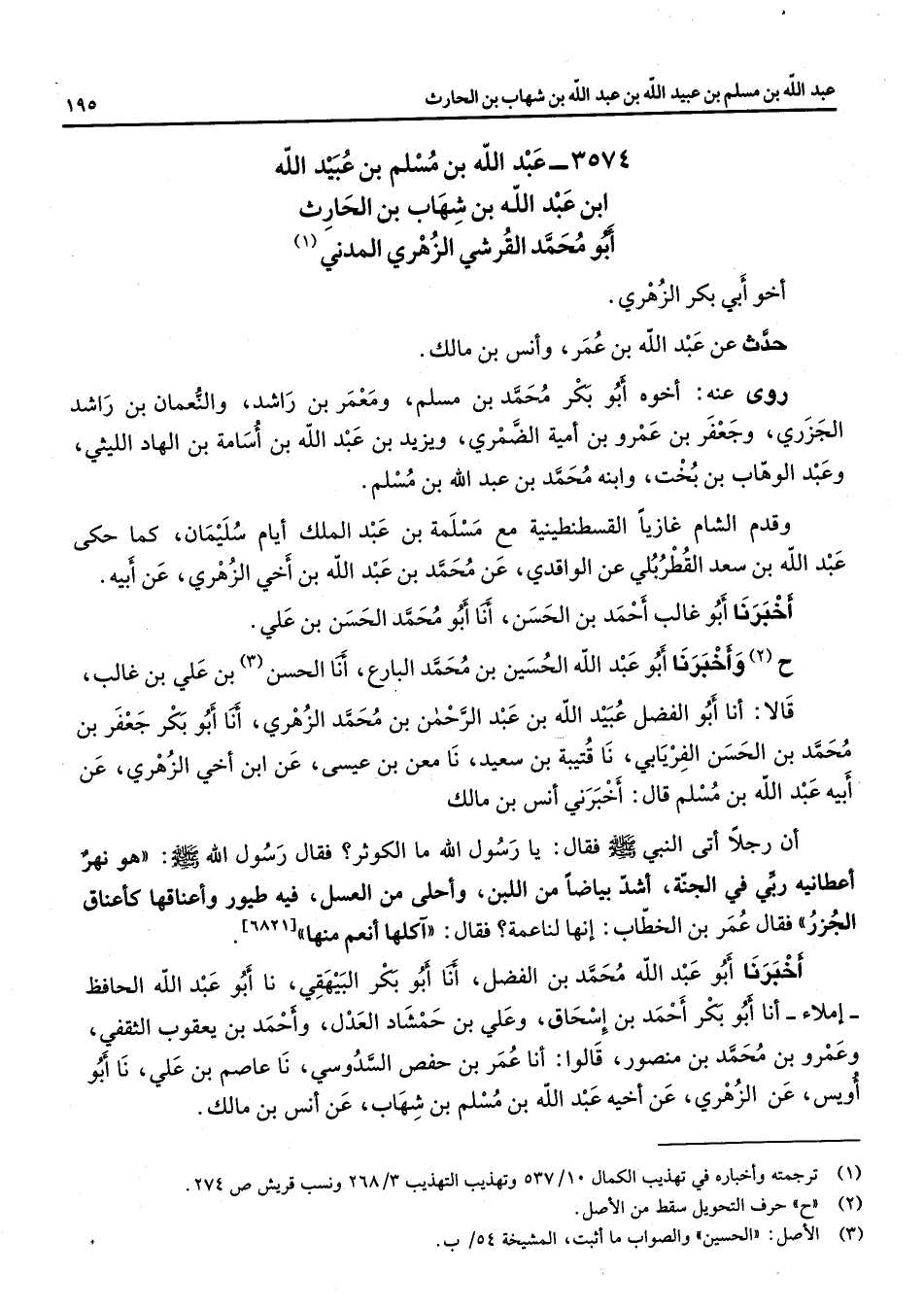 3574 - عبد الله بن مسلم بن عبيد الله ابن عبد الله بن شهاب بن الحارث أبو محمد القرشي الزهري المدني (1) أخو أبي بكر الزهري حدث عن عبد الله بن عمر وأنس بن مالك روى عنه أخوه أبو بكر محمد بن مسلم ومعمر بن راشد والنعمان بن راشد الجزري وجعفر بن عمرو بن أمية الضمري ويزيد بن عبد الله بن أسامة بن الهاد الليثي وعبد الوهاب بن بخت وابنه محمد بن عبد الله بن مسلم وقدم الشام غازيا القسطنطينية مع مسلمة بن عبد الملك أيام سليمان كما حكى عبد الله بن سعد القطربلي عن الواقدي عن محمد بن عبد الله بن أخي الزهري عن أبيه أخبرنا أبو غالب أحمد بن الحسن أنا أبو محمد الحسن بن علي ح (2) وأخبرنا أبو عبد الله الحسين بن محمد البارع أنا الحسن (3) بن علي بن غالب قالا أنا أبو الفضل عبيد الله بن عبد الرحمن بن محمد الزهري أنا أبو بكر جعفر بن محمد بن الحسن الفريابي نا قتيبة بن سعيد نا معن بن عيسى عن ابن أخي الزهري عن أبيه عبد الله بن مسلم قال أخبرني أنس بن مالك أن رجلا أتى النبي (صلى الله عليه وسلم) فقال يا رسول الله ما الكوثر فقال رسول الله (صلى الله عليه وسلم) هو نهر أعطانيه ربي في الجنة أشد بياضا من اللبن وأحلى من العسل فيه طيور وأعناقها كأعناق الجزر فقال عمر بن الخطاب إنها لناعمة فقال آكلها أنعم منها أخبرنا أبو عبد الله محمد بن الفضل أنا أبو بكر البيهقي نا أبو عبد الله الحافظ إملاء أنا أبو بكر أحمد بن إسحاق وعلي بن حمشاد العدل وأحمد بن يعقوب الثقفي وعمرو بن محمد بن منصور قالوا أنا عمر بن حفص السدوسي نا عاصم بن علي نا أبو أويس عن الزهري عن أخيه عبد الله بن مسلم بن شهاب عن أنس بن مالك