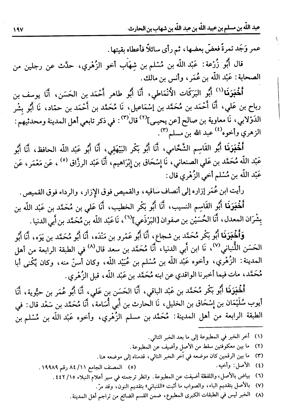 عمر وجد تمرة فعض بعضها ثم رأى سائلا فأعطاه بقيتها قال أبو زرعة عبد الله بن مسلم بن شهاب أخو الزهري حدث عن رجلين من الصحابة عبد الله بن عمر وأنس بن مالك أخبرنا (1) أبو البركات الأنماطي أنا أبو طاهر أحمد بن الحسن أنا يوسف بن رباح بن علي أنا أحمد بن محمد بن إسماعيل نا محمد بن أحمد بن حماد نا أبو بشر الدولابي نا معاوية بن صالح عن يحيى (2) قال (3) في ذكر تابعي أهل المدينة ومحدثيهم الزهري وأخوه عبد الله بن مسلم أخبرنا أبو القاسم الشحامي أنا أبو بكر البيهقي أنا أبو عبد الله الحافظ أنا أبو عبد الله محمد بن علي الصنعاني نا إسحاق بن إبراهيم أنا عبد الرزاق (5) عن معمر عن عبد الله بن مسلم أخي الزهري قال رأيت ابن عمر إزاره إلى أنصاف ساقيه والقميص فوق الإزار والرداء فوق القميص أخبرنا أبو القاسم النسيب أنا أبو بكر الخطيب أنا علي بن محمد بن عبد الله بن بشران المعدل أنا الحسين بن صفوان البرذعي (6) نا عبد الله بن محمد بن أبي الدنيا وأخبرنا أبو بكر محمد بن شجاع أنا أبو عمرو بن مندة أنا أبو محمد بن يوه أنا أبو الحسن اللنباني (7) نا ابن أبي الدنيا أنا محمد بن سعد قال (8) في الطبقة الرابعة من أهل المدينة الزهري وأخوه عبد الله بن مسلم بن عبيد الله وكان أسن منه وكان يكنى أبا محمد مات فيما أخبرنا الواقدي عن ابنه محمد بن عبد الله قبل الزهري أخبرنا أبو بكر محمد بن عبد الباقي أنا الحسن بن علي أنا أبو عمر بن حيوية أنا أيوب سليمان بن إسحاق بن الخليل نا الحارث بن أبي أسامة أنا محمد بن سعد قال في الطبقة الرابعة من أهل المدينة محمد بن مسلم الزهري وأخوه عبد الله بن مسلم بن