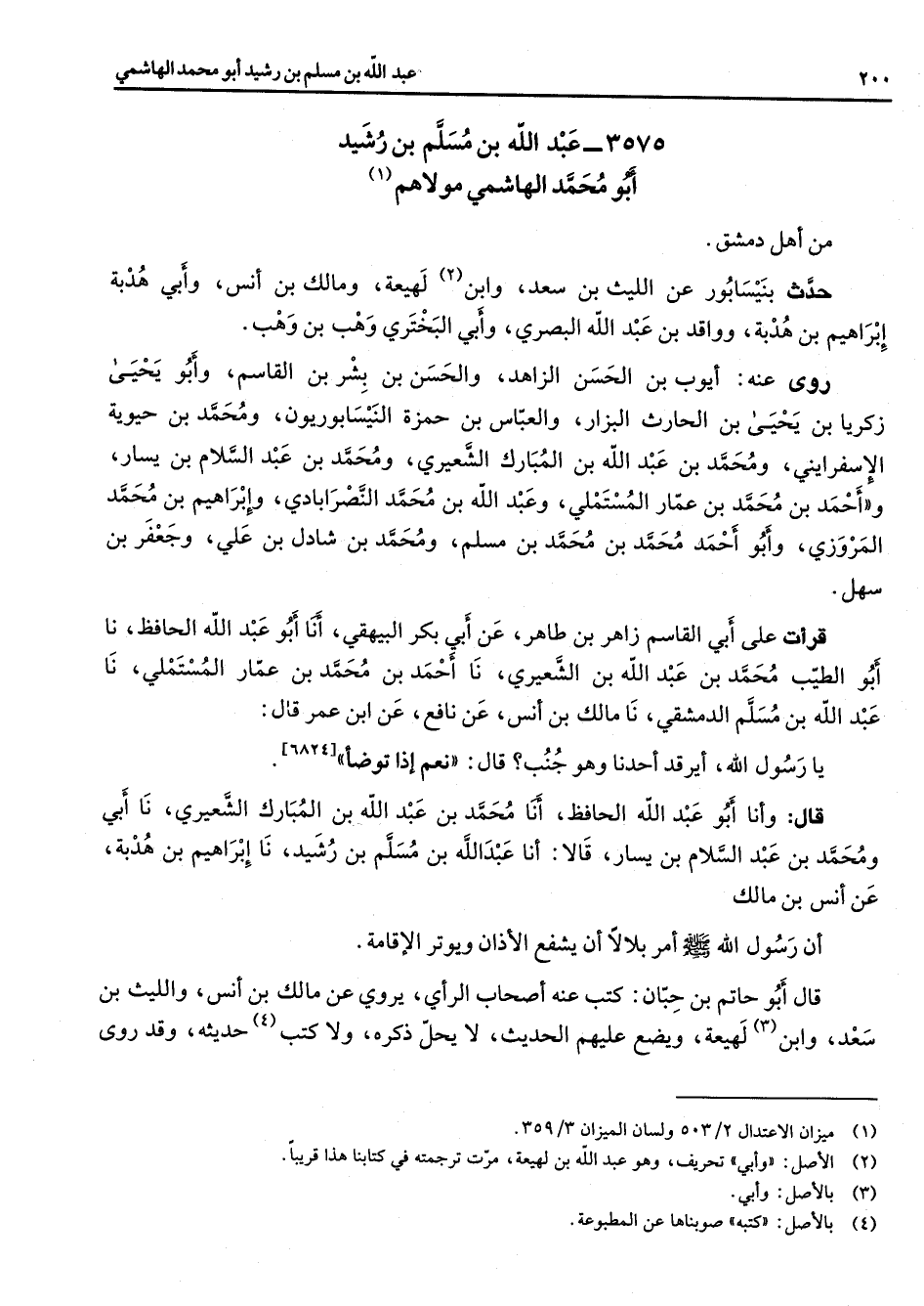 3575 - عبد الله بن مسلم بن رشيد أبو محمد الهاشمي مولاهم (1) من أهل دمشق حدث بنيسابور عن الليث بن سعد وابن (2) لهيعة ومالك بن أنس وأبي هدبة إبراهيم بن هدبة وواقد بن عبد الله البصري وأبي البختري وهب بن وهب روى عنه أيوب بن الحسن الزاهد والحسن بن بشر بن القاسم وأبو يحيى زكريا بن يحيى بن الحارث البزار والعباس بن حمزة النيسابوريون ومحمد بن حيوية الإسفرايني ومحمد بن عبد الله بن المبارك الشعيري ومحمد بن عبد السلام بن يسار وأحمد بن محمد بن عمار المستملي وعبد الله بن محمد النصرابادي وإبراهيم بن محمد المروزي وأبو أحمد محمد بن محمد بن مسلم ومحمد بن شادل بن علي وجعفر بن سهل قرأت على أبي القاسم زاهر بن طاهر عن أبي بكر البيهقي أنا أبو عبد الله الحافظ نا أبو الطيب محمد بن عبد الله بن الشعيري نا أحمد بن محمد بن عمار المستملي نا عبد الله بن مسلم الدمشقي نا مالك بن أنس عن نافع عن ابن عمر قال يا رسول الله أيرقد أحدنا وهو جنب قال نعم إذا توضأ قال وأنا أبو عبد الله الحافظ أنا محمد بن عبد الله بن المبارك الشعيري نا أبي ومحمد بن عبد السلام بن يسار قالا أنا عبد الله بن مسلم بن رشيد نا إبراهيم بن هدبة عن أنس بن مالك أن رسول الله (صلى الله عليه وسلم) أمر بلالا أن يشفع الأذان ويوتر الإقامة قال أبو حاتم بن حبان كتب عنه أصحاب الرأي يروي عن مالك بن أنس والليث بن سعد وابن (3) لهيعة ويضع عليهم الحديث لا يحل ذكره ولا كتب (4) حديثه وقد روى