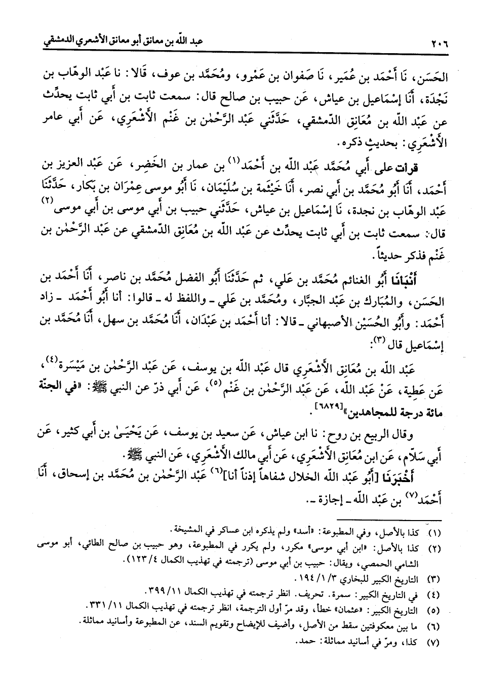 بن الحسن نا أحمد بن عمير نا صفوان بن عمرو ومحمد بن عوف قالا نا عبد الوهاب بن نجدة أنا إسماعيل بن عياش عن حبيب بن صالح قال سمعت ثابت بن أبي ثابت يحدث عن عبد الله بن معانق الدمشقي حدثني عبد الرحمن بن غنم الأشعري عن أبي عامر الأشعري بحديث ذكره قرأت على أبي محمد عبد الله بن أحمد (1) بن عمار بن الخضر عن عبد العزيز بن أحمد أنا أبو محمد بن أبي نصر أنا خيثمة بن سليمان نا أبو موسى عمران بن بكار حدثنا عبد الوهاب بن نجدة نا إسماعيل بن عياش حدثني حبيب بن أبي موسى بن أبي موسى (2) قال سمعت ثابت بن أبي ثابت يحدث عن عبد الله بن معانق الدمشقي عن عبد الرحمن بن غنم فذكر حديثا أنبأنا أبو الغنائم محمد بن علي ثم حدثنا أبو الفضل محمد بن ناصر أنا أحمد بن الحسن والمبارك بن عبد الجبار ومحمد بن علي واللفظ له قالوا أنا أبو أحمد زاد أحمد وأبو الحسين الأصبهاني قالا أنا أحمد بن عبدان أنا محمد بن سهل أنا محمد بن إسماعيل قال (3) عبد الله بن معانق الأشعري قال عبد الله بن يوسف عن عبد الرحمن بن ميسرة (4) عن عطية عن عبد الله عن عبد الرحمن بن غنم (5) عن أبي ذر عن النبي (صلى الله عليه وسلم) في الجنة مائة درجة للمجاهدين وقال الربيع بن روح نا ابن عياش عن سعيد بن يوسف عن يحيى بن أبي كثير عن أبي سلام عن ابن معانق الأشعري عن أبي مالك الأشعري عن النبي (صلى الله عليه وسلم) أخبرنا أبو عبد الله الخلال شفاها إذنا أنا (6) عبد الرحمن بن محمد بن إسحاق أنا أحمد (7) بن عبد الله إجازة