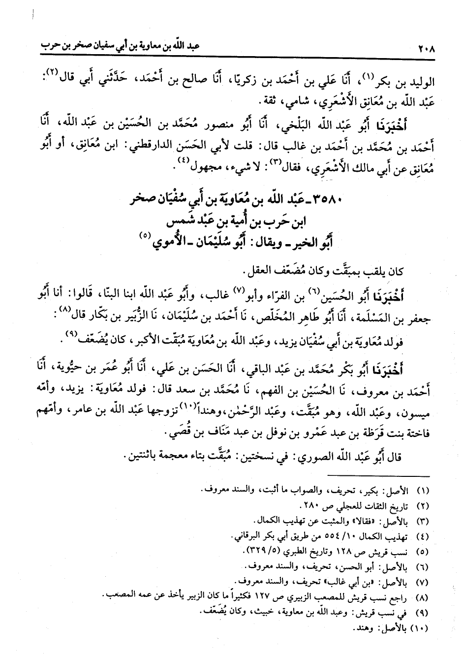 3580 - عبد الله بن معاوية بن أبي سفيان صخر ابن حرب بن أمية بن عبد شمس أبو الخير ويقال أبو سليمان الأموي (5) كان يلقب بمبقت وكان مضعف العقل أخبرنا أبو الحسين (6) بن الفراء وأبو (7) غالب وأبو عبد الله ابنا البنا قالوا أنا أبو جعفر بن المسلمة أنا أبو طاهر المخلص نا أحمد بن سليمان نا الزبير بن بكار قال (8) فولد معاوية بن أبي سفيان يزيد وعبد الله بن معاوية مبقت الأكبر كان يضعف (9) أخبرنا أبو بكر محمد بن عبد الباقي أنا الحسن بن علي أنا أبو عمر بن حيوية أنا أحمد بن معروف نا الحسين بن الفهم نا محمد بن سعد قال فولد معاوية يزيد وأمه ميسون وعبد الله وهو مبقت وعبد الرحمن وهندا (10) تزوجها عبد الله بن عامر وأمهم فاخته بنت قرظة بن عبد عمرو بن نوفل بن عبد مناف بن قصي قال أبو عبد الله الصوري في نسختين مبقت بتاء معجمة باثنتين
