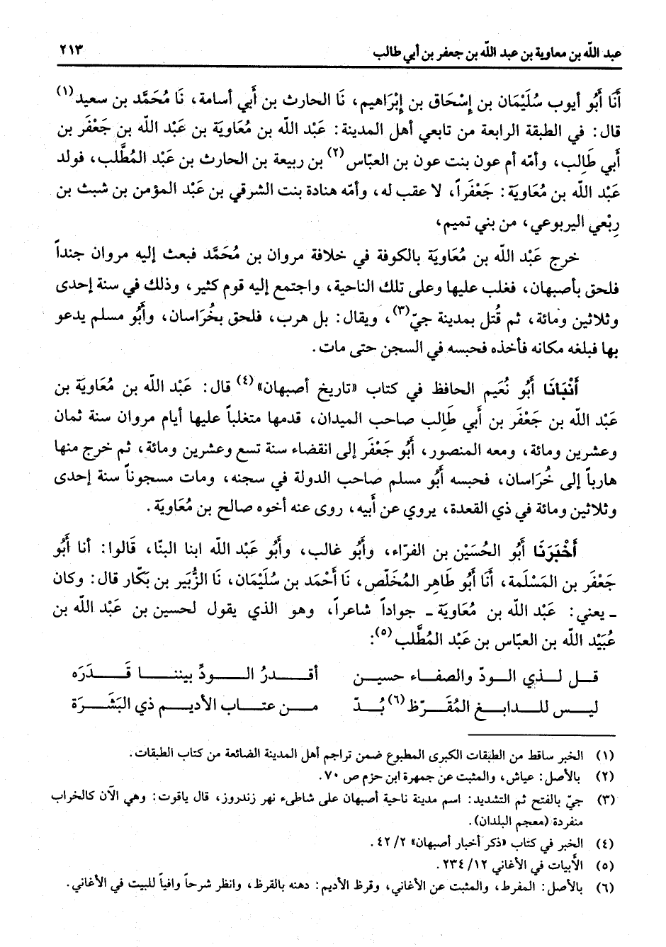 أنا أبو أيوب سليمان بن إسحاق بن إبراهيم نا الحارث بن أبي أسامة نا محمد بن سعيد (1) قال في الطبقة الرابعة من تابعي أهل المدينة عبد الله بن معاوية بن عبد الله بن جعفر بن أبي طالب وأمه أم عون بنت عون بن العباس (2) بن ربيعة بن الحارث بن عبد المطلب فولد عبد الله بن معاوية جعفرا لا عقب له وأمه هنادة بنت الشرقي بن عبد المؤمن بن شبث بن ربعي اليربوعي من بني تميم خرج عبد الله بن معاوية بالكوفة في خلافة مروان بن محمد فبعث إليه مروان جندا فلحق بأصبهان فغلب عليها وعلى تلك الناحية واجتمع إليه قوم كثير وذلك في سنة إحدى وثلاثين ومائة ثم قتل بمدينة جي (3) ويقال بل هرب فلحق بخراسان وأبو مسلم يدعو بها فبلغه مكانه فأخذه فحبسه في السجن حتى مات أنبأنا أبو نعيم الحافظ في كتاب تاريخ أصبهان (4) قال عبد الله بن معاوية بن عبد الله بن جعفر بن أبي طالب صاحب الميدان قدمها متغلبا عليها أيام مروان سنة ثمان وعشرين ومائة ومعه المنصور أبو جعفر إلى انقضاء سنة تسع وعشرين ومائة ثم خرج منها هاربا إلى خراسان فحبسه أبو مسلم صاحب الدولة في سجنه ومات مسجونا سنة إحدى وثلاثين ومائة في ذي القعدة يروي عن أبيه روى عنه أخوه صالح بن معاوية أخبرنا أبو الحسين بن الفراء وأبو غالب وأبو عبد الله ابنا البنا قالوا أنا أبو جعفر بن المسلمة أنا أبو طاهر المخلص نا أحمد بن سليمان نا الزبير بن بكار قال وكان يعني عبد الله بن معاوية جوادا شاعرا وهو الذي يقول لحسين بن عبد الله بن عبيد الله بن العباس بن عبد المطلب (5) * قل لذي الود والصفاء حسين * أقدر الود بيننا قدره ليس للدابغ المقرظ (6) بد * من عتاب الأديم ذي البشرة *