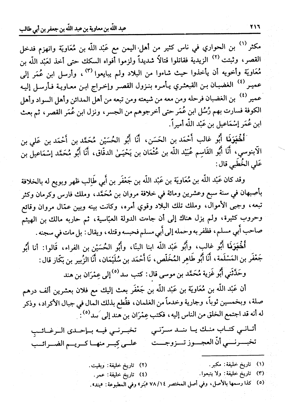 مكثر (1) بن الحواري في ناس كثير من أهل اليمن مع عبد الله بن معاوية وانهزم فدخل القصر وثبتت (2) الزيدية فقاتلوا قتالا شديدا ولزموا أفواه السكك حتى أخذ لعبد الله بن معاوية وأخويه أن يأخذوا حيث شاءوا من البلاد ولم يبايعوا (3) وأرسل ابن عمر إلى عمير (4) الغضبان بن القبعثري يأمره بنزول القصر وإخراج ابن معاوية فأرسل إليه عمير (4) بن الغضبان فرحله ومن معه من شيعته ومن تبعه من أهل المدائن وأهل السواد وأهل الكوفة فسارت بهم رسل ابن عمر حتى أخرجوهم من الجسر ونزل ابن عمر القصر ثم بعث ابن عمر إسماعيل بن عبد الله أميرا أخبرنا أبو غالب أحمد بن الحسين أنا أبو الحسين محمد بن أحمد بن علي بن الآبنوسي أنا أبو القاسم عبيد الله بن عثمان بن يحيى الدقاق أنا أبو محمد إسماعيل بن علي الخطبي قال وقد كان عبد الله بن معاوية بن عبد الله بن جعفر بن أبي طالب ظهر وبويع له بالخلافة بأصبهان في سنة سبع وعشرين ومائة في خلافة مروان بن محمد وملك فارس وكرمان وكثر تبعه وجبى الأموال وملك تلك البلاد وقوي أمره وكانت بينه وبين عمال مروان وقائع وحروب كثيرة ولم يزل هناك إلى أن جاءت الدولة العباسية ثم حاربه مالك بن الهيثم صاحب أبي مسلم فظفر به وحمله إلى أبي مسلم فحبسه وقتله ويقال بل مات في سجنه أخبرنا أبو غالب وأبو عبد الله ابنا البنا وأبو الحسين بن الفراء قالوا أنا أبو جعفر بن المسلمة أنا أبو طاهر المخلص نا أحمد بن سليمان أنا الزبير بن بكار قال وحدثني أبو غزية محمد بن موسى قال كتب بند (5) إلى عمران بن هند أن عبد الله بن معاوية بن عبد الله بن جعفر بعث إليك مع فلان بعشرين ألف درهم صلة وبخمسين ثوبا وجارية وخدما من الغلمان فقطع بذلك المال في جبال الأكراد وذكر له أنه قد اجتمع الخلق من الناس إليه فكتب عمران بن هند إلى بند (5) * أتاني كتاب منك يا بند سرني * تخبرني فيه بإحدى الرغائب تخبرني أن العجوز تزوجت * على كبر منها كريم الضرائب