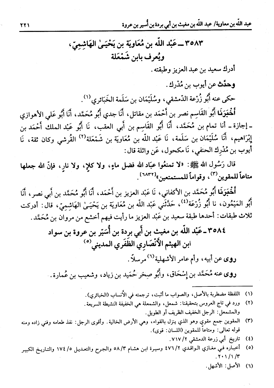 3583 - عبد الله بن معاوية بن يحيى الهاشمي ويعرف بابن شمعلة أدرك سعيد بن عبد العزيز وطبقته وحدث عن أيوب بن مدرك حكى عنه أبو زرعة الدمشقي وسليمان بن سلمة الخبائري (1) أخبرنا أبو القاسم نصر بن أحمد بن مقاتل أنا جدي أبو محمد أنا أبو علي الأهوازي إجازة أنا تمام بن محمد أنا أبو القاسم بن أبي العقب نا أبو عبد الملك أحمد بن إبراهيم أنا سليمان بن سلمة نا عبد الله بن معاوية بن شمعلة (2) القرشي وكان ثقة نا أيوب بن مدرك الحنفي نا مكحول عن واثلة قال قال رسول الله (صلى الله عليه وسلم) لا تمنعوا عباد الله فضل ماء ولا كلإ ولا نار فإن الله جعلها متاعا للمقوين (3) وقواما للمستمتعين أخبرنا أبو محمد بن الأكفاني نا عبد العزيز بن أحمد أنا أبو محمد بن أبي نصر أنا أبو الميمون نا أبو زرعة (4) حدثني عبد الله بن معاوية بن يحيى الهاشمي قال أدركت ثلاث طبقات أحدها طبقة سعيد بن عبد العزيز ما رأيت فيهم أخشع من مروان بن محمد