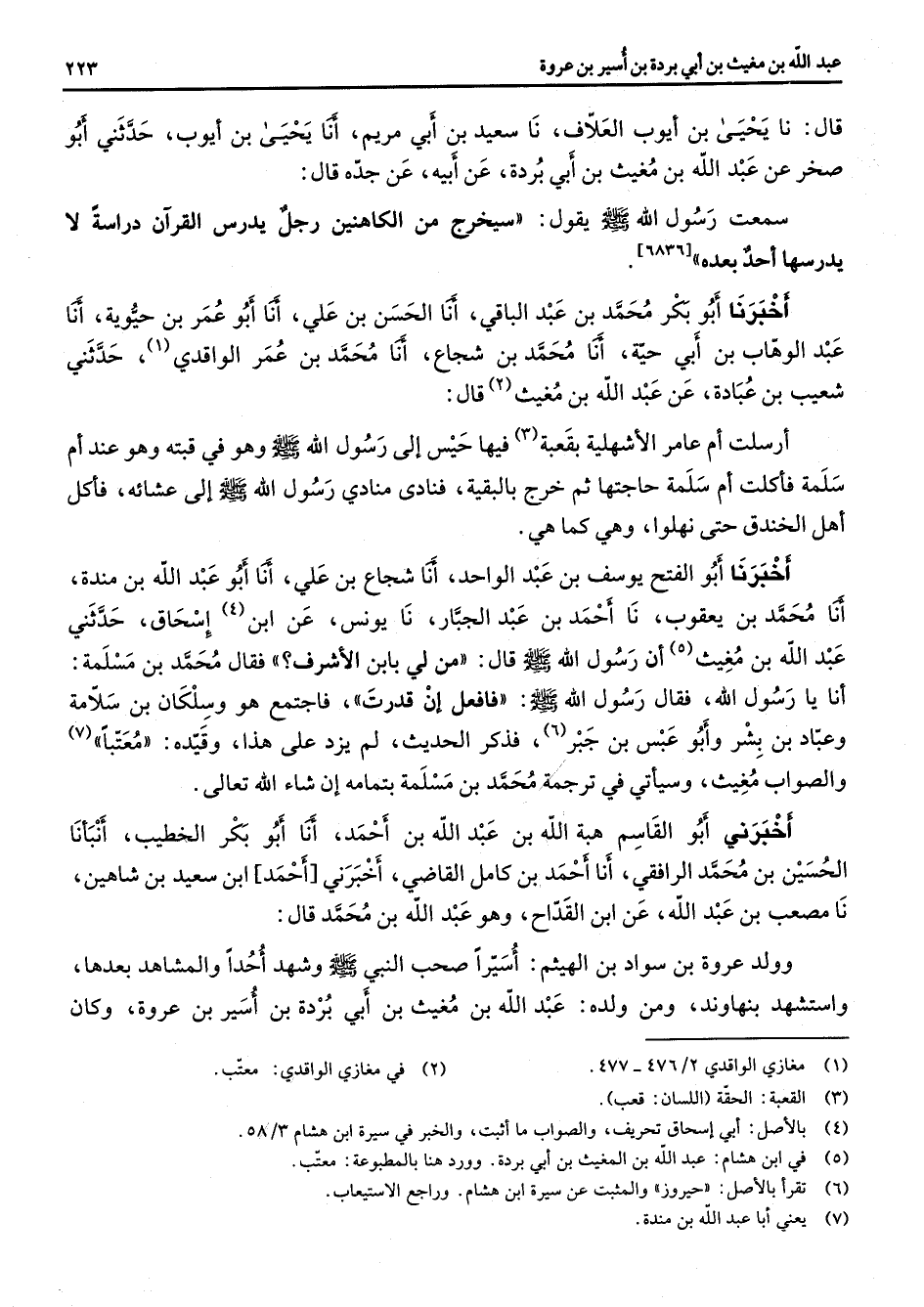 قال نا يحيى بن أيوب العلاف نا سعيد بن أبي مريم أنا يحيى بن أيوب حدثني أبو صخر عن عبد الله بن مغيث بن أبي بردة عن أبيه عن جده قال سمعت رسول الله (صلى الله عليه وسلم) يقول سيخرج من الكاهنين رجل يدرس القرآن دراسة لا يدرسها أحد بعده أخبرنا أبو بكر محمد بن عبد الباقي أنا الحسن بن علي أنا أبو عمر بن حيوية أنا عبد الوهاب بن أبي حية أنا محمد بن شجاع أنا محمد بن عمر الواقدي (1) حدثني شعيب بن عبادة عن عبد الله بن مغيث (2) قال أرسلت أم عامر الأشهلية بقعبة (3) فيها حيس إلى رسول الله (صلى الله عليه وسلم) وهو في قبته وهو عند أم سلمة فأكلت أم سلمة حاجتها ثم خرج بالبقية فنادى منادي رسول الله (صلى الله عليه وسلم) إلى عشائه فأكل أهل الخندق حتى نهلوا وهي كما هي أخبرنا أبو الفتح يوسف بن عبد الواحد أنا شجاع بن علي أنا أبو عبد الله بن مندة أنا محمد بن يعقوب نا أحمد بن عبد الجبار نا يونس عن ابن (4) إسحاق حدثني عبد الله بن مغيث (5) أن رسول الله (صلى الله عليه وسلم) قال من لي بابن الأشرف فقال محمد بن مسلمة أنا يا رسول الله فقال رسول الله (صلى الله عليه وسلم) فافعل إن قدرت فاجتمع هو وسلكان بن سلامة وعباد بن بشر أبو عبس بن جبر (6) فذكر الحديث لم يزد على هذا وقيده معتبا (7) والصواب مغيث وسيأتي في ترجمة محمد بن مسلمة بتمامه إن شاء الله تعالى أخبرني أبو القاسم هبة الله بن عبد الله بن أحمد أنا أبو بكر الخطيب أنبأنا الحسين بن محمد الرافقي أنا أحمد بن كامل القاضي أخبرني أحمد ابن سعيد بن شاهين نا مصعب بن عبد الله عن ابن القداح وهو عبد الله بن محمد قال وولد عروة بن سواد بن الهيثم أسيرا صحب النبي (صلى الله عليه وسلم) وشهد أحدا والمشاهد بعدها واستشهد بنهاوند ومن ولده عبد الله بن مغيث بن أبي بردة بن أسير بن عروة وكان