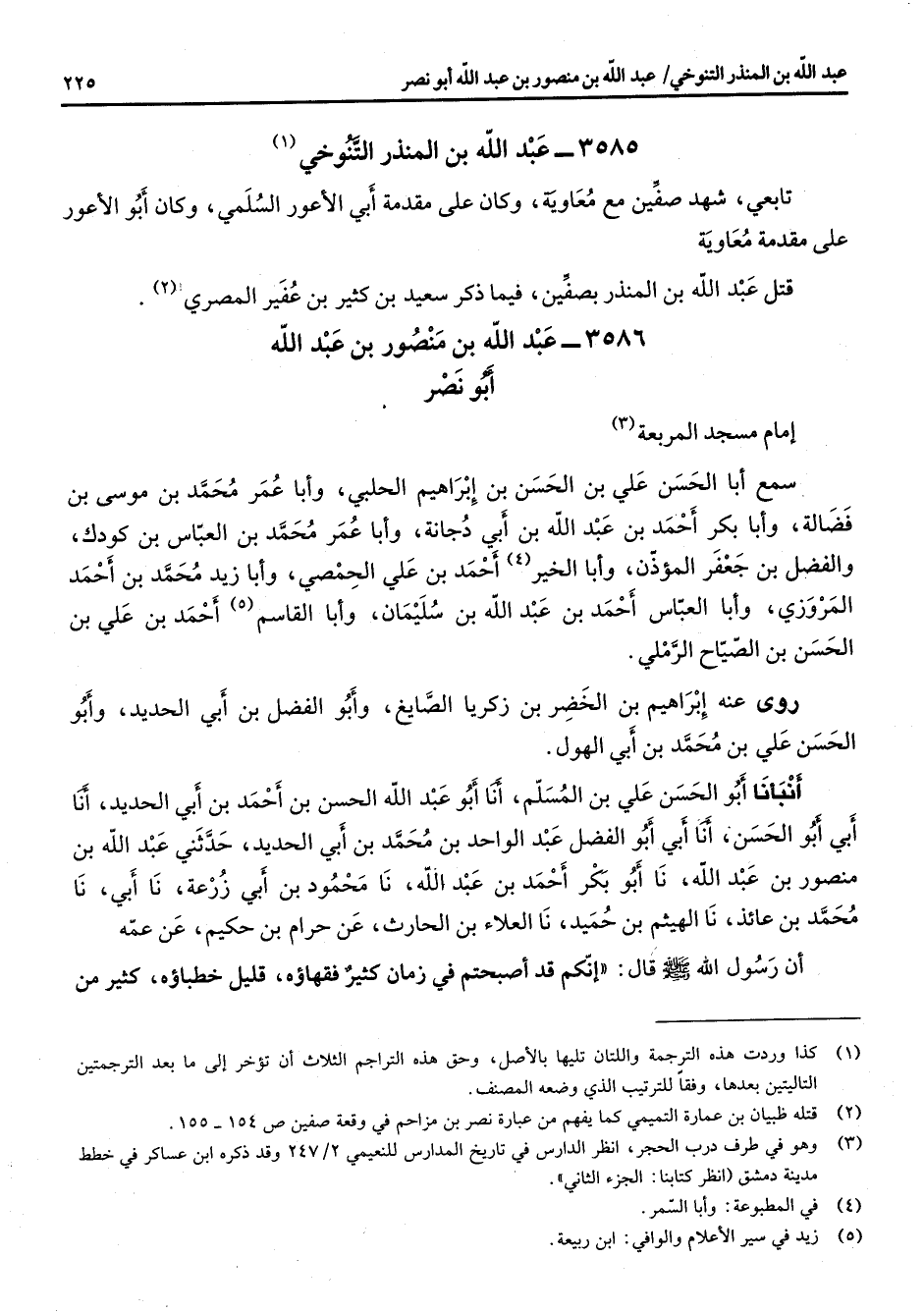 3585 - عبد الله بن المنذر التنوخي (1) تابعي شهد صفين مع معاوية وكان على مقدمة أبي الأعور السلمي وكان أبو الأعور على مقدمة معاوية قتل عبد الله بن المنذر بصفين فيما ذكر سعيد بن كثير بن عفير المصري (2)