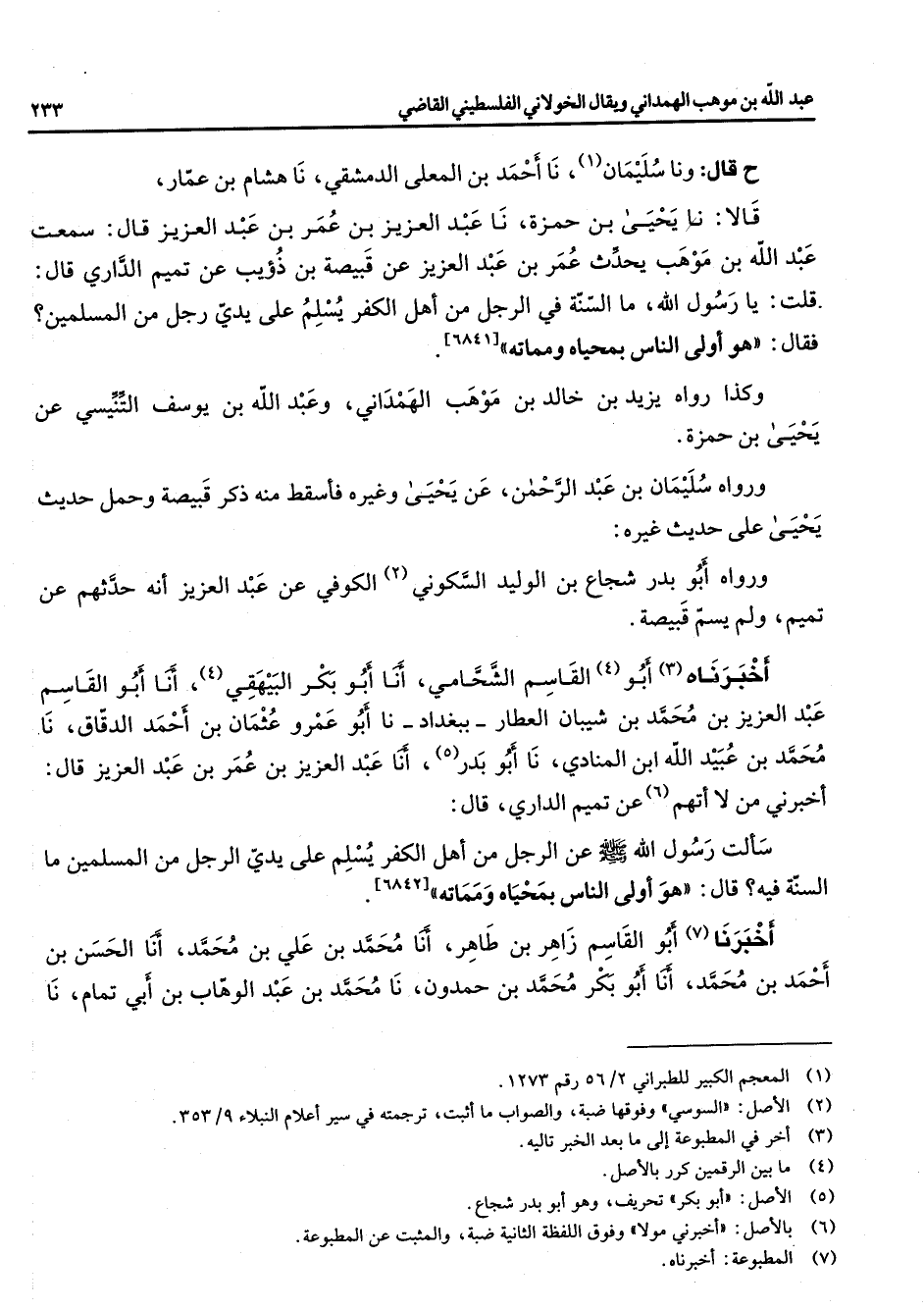 ح قال ونا سليمان (2) نا أحمد بن المعلى الدمشقي نا هشام بن عمار قالا نا يحيى بن حمزة نابن عمر بن عبد العزيز قال سمعت عبد الله بن موهب يحدث عمر بن عبد العزيز عن قبيصة بن ذؤيب عن تميم الداري قال قلت يا رسول الله ما السنة في الرجل من أهل الكفر يسلم على يدي رجل من المسلمين فقال هو أولى الناس بمحياه ومماته [* * *] وكذا رواه يزيد بن خالد بن موهب الهمداني وعبد الله بن يوسف التنيسي عن يحيى بن حمزة ورواه سليمان بن عبد الرحمن عن يحيى وغيره فأسقط منه ذكر قبيصة وحمل حديث يحيى على حديث غيره ورواه أبو بدر شجاع بن الوليد السكوني (2) الكوفي عن عبد العزيز أنه حدثهم عن تميم ولم يسم قبيصة أخبرناه (3) أبو (4) القاسم الشحامي أنا أبو بكر البيهقي أنا أبو القاسم عبد العزيز بن محمد بن شيبان العطار ببغداد نا أبو عمرو عثمان بن أحمد الدقاق نا محمد بن عبيد الله ابن المنادي نا أبو بدر (5) أنا عبد العزيز بن عمر بن عبد العزيز قال أخبرني من لا أتهم (6) عن تميم الداري قال سألت رسول الله (صلى الله عليه وسلم) عن الرجل من أهل الكفر يسلم على يدي الرجل من المسلمين ما السنة فيه قال هو أولى الناس بمحياه ومماته أخبرنا (7) أبو القاسم زاهر بن طاهر أنا محمد بن علي بن محمد أنا الحسن بن أحمد بن محمد أنا أبو بكر محمد بن حمدون نا محمد بن عبد الوهاب بن أبي تمام نا