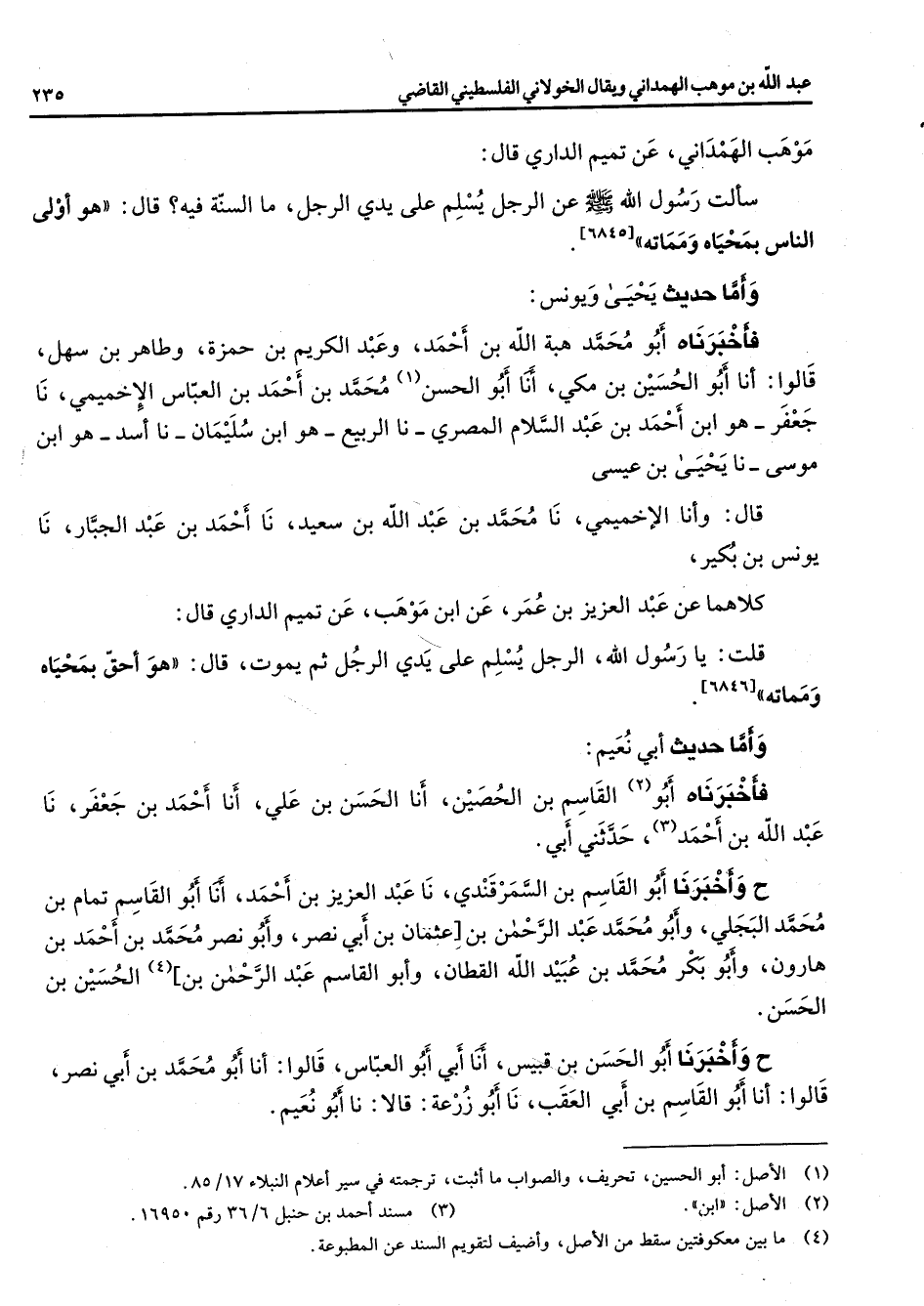 موهب الهمداني عن تميم الداري قال سألت رسول الله (صلى الله عليه وسلم) عن الرجل يسلم على يدي الرجل ما السنة فيه قال هو أولى الناس بمحياه ومماته وأما حديث يحيى ويونس فأخبرناه أبو محمد هبة الله بن أحمد وعبد الكريم بن حمزة وطاهر بن سهل قالوا أنا أبو الحسين بن مكي أنا أبو الحسن (1) محمد بن أحمد بن العباس الأخميمي نا جعفر هو ابن أحمد بن عبد السلام المصري نا الربيع هو ابن سليمان نا أسد هو ابن موسى نا يحيى بن عيسى قال وأنا الإخميمي نا محمد بن عبد الله بن سعيد نا أحمد بن عبد الجبار نا يونس بن بكير كلاهما عن عبد العزيز بن عمر عن ابن موهب عن تميم الداري قال قلت يا رسول الله الرجل يسلم على يدي الرجل ثم يموت قال هو أحق بمحياه ومماته وأما حديث أبي نعيم فأخبرناه (2) أبو القاسم بن الحصين أنا الحسن بن علي أنا أحمد بن جعفر نا عبد الله بن أحمد (3) حدثني أبي ح وأخبرنا أبو القاسم بن السمرقندي نا عبد العزيز بن أحمد أنا أبو القاسم تمام بن محمد البجلي وأبو محمد عبد الرحمن بن عثمان بن أبي نصر وأبو نصر محمد بن أحمد بن هارون وأبو بكر محمد بن عبيد الله القطان وأبو القاسم عبد الرحمن بن (4) الحسين بن الحسن ح وأخبرنا أبو الحسن بن قبيس أنا أبي أبو العباس قالوا أنا أبو محمد بن أبي نصر قالوا أنا أبو القاسم بن أبي العقب نا أبو زرعة قالا نا أبو نعيم