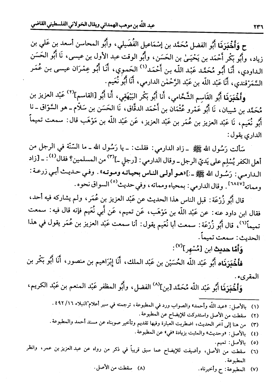 ح وأخبرنا أبو الفضل محمد بن إسماعيل الفضيلي وأبو المحاسن أسعد بن علي بن زياد وأبو بكر أحمد بن يحيى بن الحسن وأبو الوقت عبد الأول بن عيسى نا أبو الحسن الداودي أنا أبو محمد عبد الله بن أحمد (1) الحموي أنا أبو عمران عيسى بن عمر السمرقندي أنا عبد الله بن عبد الرحمن الدارمي أنا أبو نعيم وأخبرنا أبو القاسم الشحامي أنا أبو بكر البيهقي أنا أبو القاسم (2) عبد العزيز بن محمد بن شيبان نا أبو عمرو عثمان بن أحمد الدقاق نا الحسن بن سلام هو السواق نا أبو نعيم نا عبد العزيز بن عمر بن عبد العزيز عن عبد الله بن موهب قال سمعت تميما الداري يقول سألت رسول الله (صلى الله عليه وسلم) زاد الدارمي فقلت يا رسول الله ما السنة في الرجل من أهل الكفر يسلم على يدي الرجل وقال الدارمي رجل (3) من المسلمين فقال (4) زاد الدارمي رسول الله (صلى الله عليه وسلم) هو أولى الناس بحياته وموته وفي حديث أبي زرعة ومماته وقال الدارمي بمحياه ومماته وفي حديث (5) السواق نحوه قال أبو زرعة قبل الناس هذا الحديث عن عبد العزيز بن عمر ولم يشاركه فيه أحد فقال ابن داود عنه عن عبد الله بن موهب عن تميم عن أبي نعيم فإنه قال فيه سمعت تميما (6) قال أبو زرعة سمعت أبا نعيم يقول أنا سمعت عبد العزيز بن عمر يقول في هذا الحديث سمعت تميما وأما حديث ابن مسهر (7) فأخبرناه أبو عبد الله الحسين بن عبد الملك أنا إبراهيم بن منصور أنا أبو بكر بن المقرئ وأخبرنا أبو عبد الله محمد بن (8) الفضل وأبو المظفر عبد المنعم بن عبد الكريم