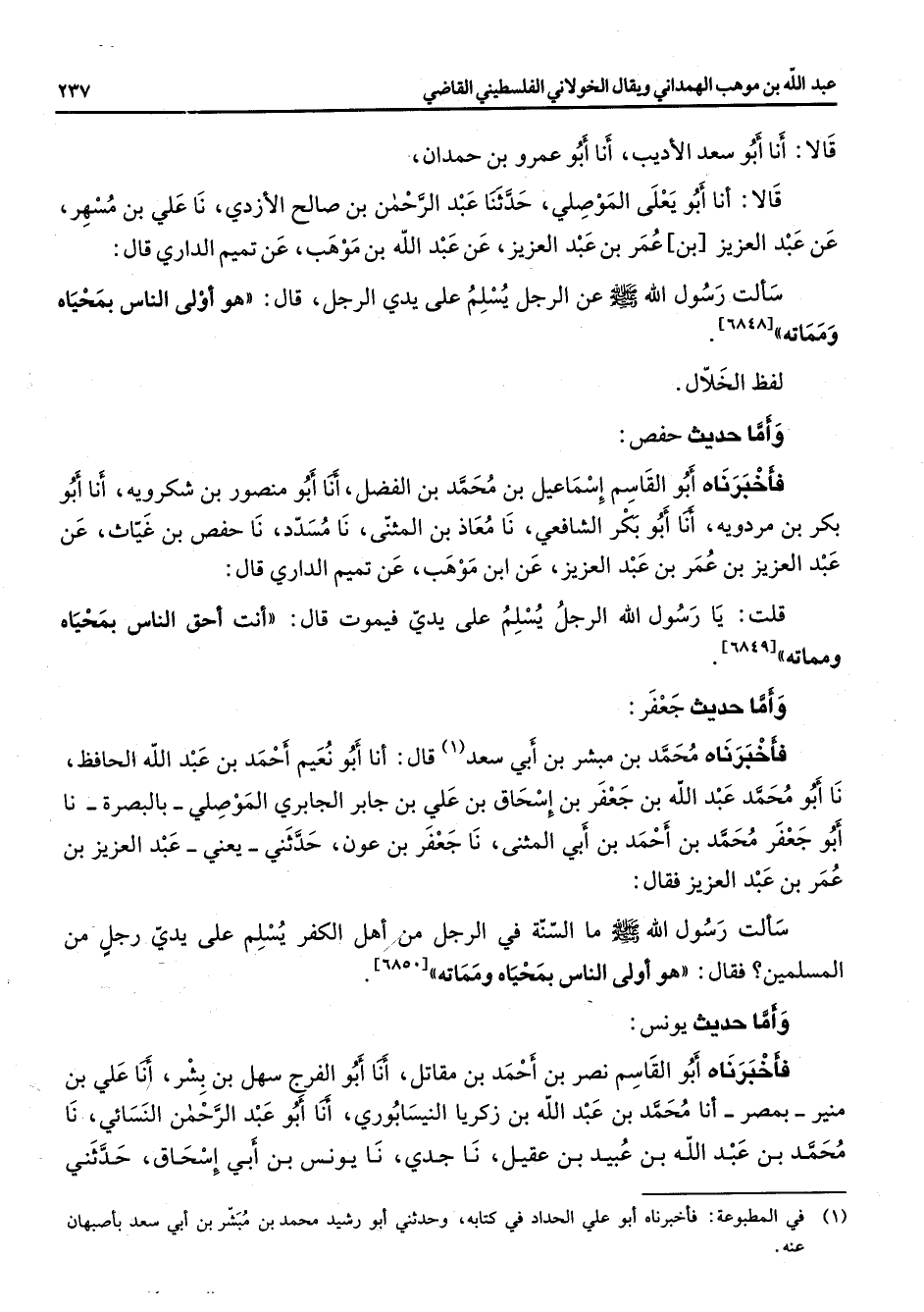 قالا أنا أبو سعد الأديب أنا أبو عمرو بن حمدان قالا أنا أبو يعلى الموصلي حدثنا عبد الرحمن بن صالح الأزدي نا علي بن مسهر عن عبد العزيز بن عمر بن عبد العزيز عن عبد الله بن موهب عن تميم الداري قال سألت رسول الله (صلى الله عليه وسلم) عن الرجل يسلم على يدي الرجل قال هو أولى الناس بمحياه ومماته لفظ الخلال وأما حديث حفص فأخبرناه أبو القاسم إسماعيل بن محمد بن الفضل أنا أبو منصور بن شكرويه أنا أبو بكر بن مردوية أنا أبو بكر الشافعي نا معاذ بن المثنى نا مسدد نا حفص بن غياث عن عبد العزيز بن عمر بن عبد العزيز عن ابن موهب عن تميم الداري قال قلت يا رسول الله الرجل يسلم على يدي فيموت قال أنت أحق الناس بمحياه ومماته وأما حديث جعفر فأخبرناه محمد بن مبشر بن أبي سعد (1) قال أنا أبو نعيم أحمد بن عبد الله الحافظ نا أبو محمد عبد الله بن جعفر بن إسحاق بن علي بن جابر الجابري الموصلي بالبصرة نا أبو جعفر محمد بن أحمد بن أبي المثنى نا جعفر بن عون حدثني يعني عبد العزيز بن عمر بن عبد العزيز قال سألت رسول الله (صلى الله عليه وسلم) ما السنة في الرجل من أهل الكفر يسلم على يدي رجل من